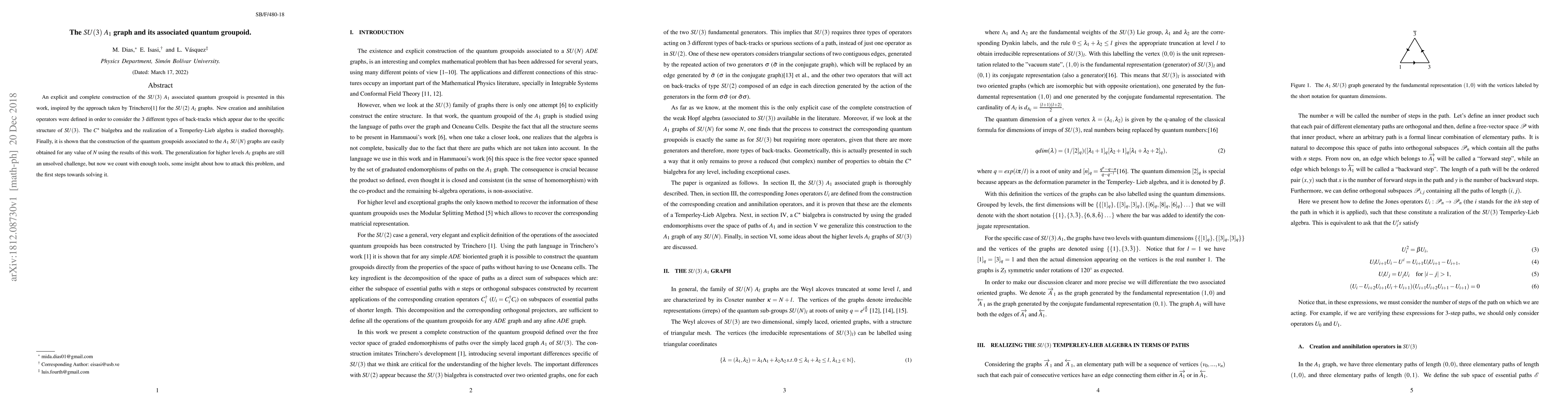 This paper constructs the $SU(3)$ $A_1$ associated quantum groupoid, introducing new operators for back-tracks specific to $SU(3)$ and studying its $C^{\star}$ bialgebra and Temperley-Lieb algebra realization. The generalization to $A_{1}$ $SU(N)$ graphs for any $N$ is demonstrated, though extending to higher level $A_l$ graphs remains an open challenge.