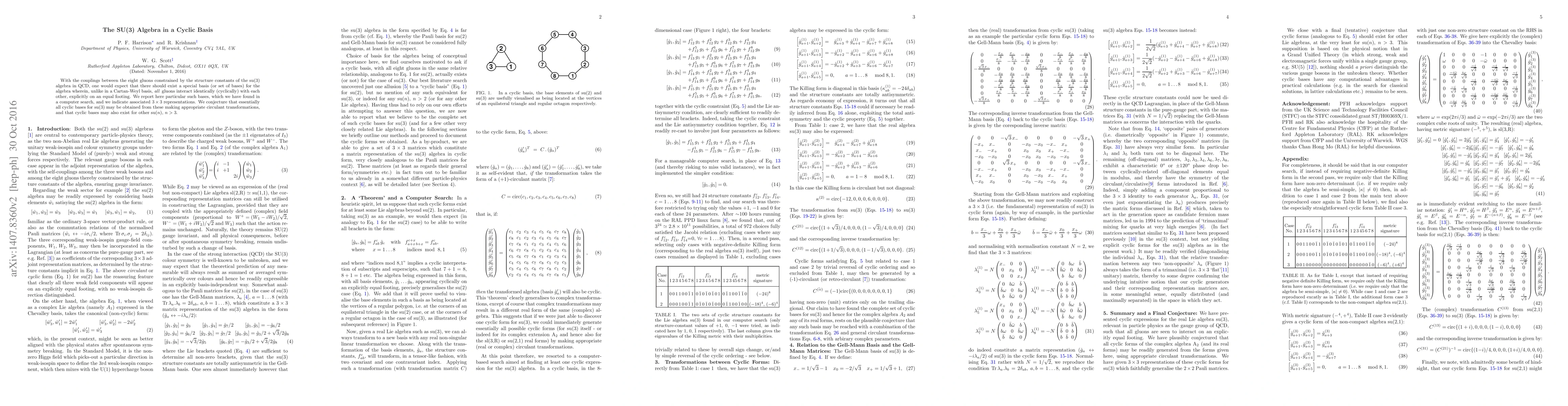 With the couplings between the eight gluons constrained by the structure constants of the su(3) algebra in QCD, one would expect that there should exist a special basis (or set of bases) for the algebra wherein, unlike in a Cartan-Weyl basis, {\em all} gluons interact identically (cyclically) with each other, explicitly on an equal footing. We report here particular such bases, which we have found in a computer search, and we indicate associated $3 \times 3$ representations. We conjecture that essentially all cyclic bases for su(3) may be obtained from these making appropriate circulant transformations,and that cyclic bases may also exist for other su(n), n>3.
