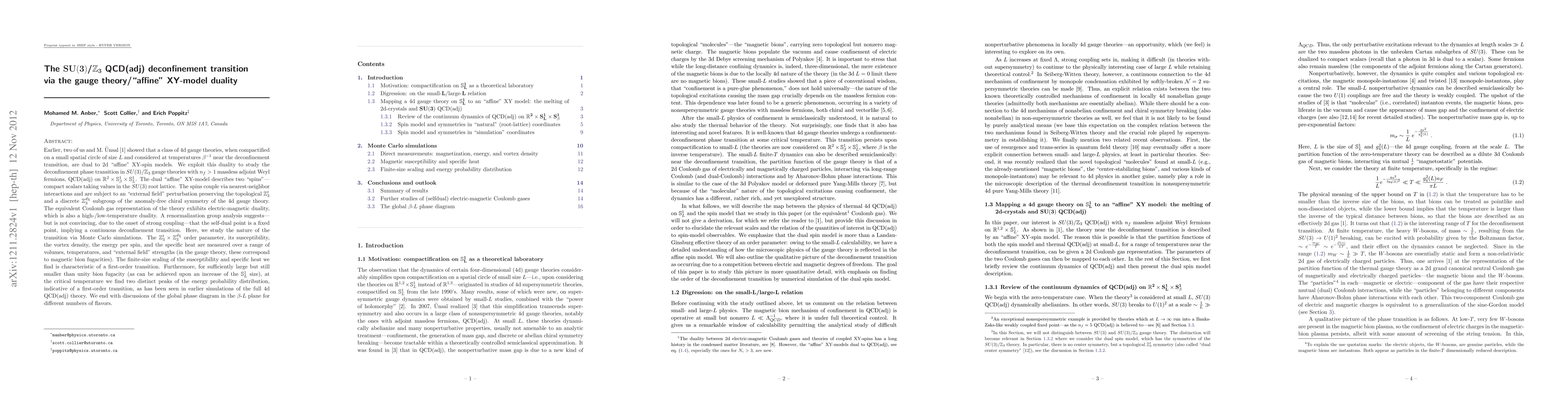 Earlier, two of us and M. Unsal [arXiv:1112.6389] showed that some 4d gauge theories, compactified on a small spatial circle of size L and considered at temperatures 1/beta near deconfinement, are dual to 2d "affine" XY-spin models. We use the duality to study deconfinement in SU(3)/Z_3 theories with n_f>1 massless adjoint Weyl fermions, QCD(adj) on R^2 x S^1_beta x S^1_L. The"affine" XY-model describes two "spins" - compact scalars taking values in the SU(3) root lattice, with nearest-neighbor interactions and subject to an "external field" preserving the topological Z_3^t and a discrete Z_3^chi subgroup of the chiral symmetry of the 4d gauge theory. The equivalent Coulomb gas representation of the theory exhibits electric-magnetic duality, which is also a high-/low-temperature duality. A renormalization group analysis suggests - but is not convincing, due to the onset of strong coupling - that the self-dual point is a fixed point, implying a continuous deconfinement transition. Here, we study the nature of the transition via Monte Carlo simulations. The Z_3^t x Z_3^chi order parameter, its susceptibility, the vortex density, the energy per spin, and the specific heat are measured over a range of volumes, temperatures, and "external field" strengths (in the gauge theory, these correspond to magnetic bion fugacities). The finite-size scaling of the susceptibility and specific heat we find is characteristic of a first-order transition. Furthermore, for sufficiently large but still smaller than unity bion fugacity (as can be achieved upon an increase of the S^1_L size), at the critical temperature we find two distinct peaks of the energy probability distribution, indicative of a first-order transition, as has been seen in earlier simulations of the full 4d QCD(adj) theory. We end with discussions of the global phase diagram in the beta-L plane for different numbers of flavors.