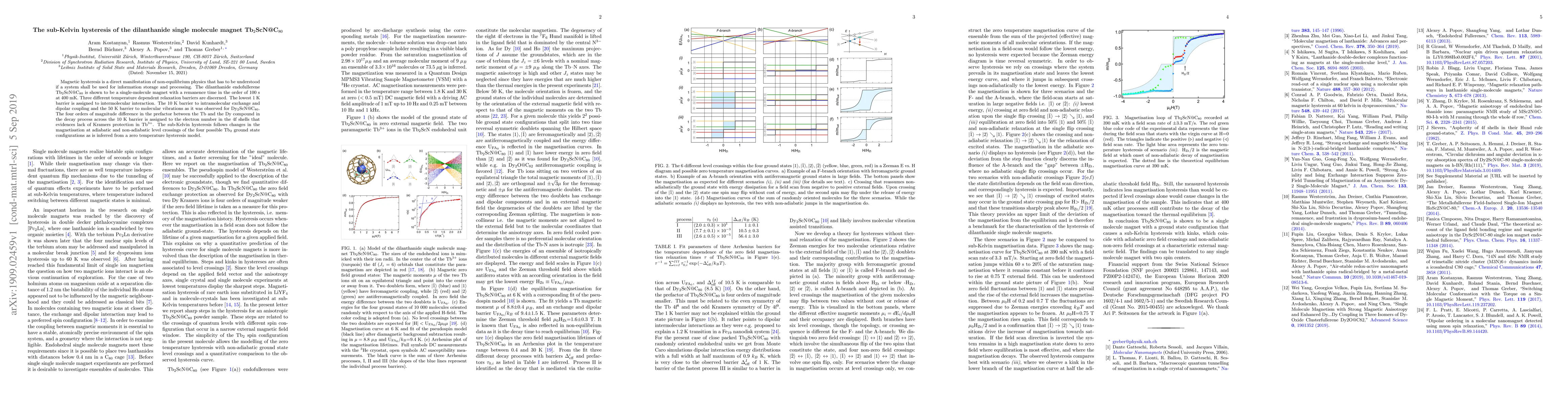 Magnetic hysteresis is a direct manifestation of non-equilibrium physics that has to be understood if a system shall be used for information storage and processing. The dilanthanide endofullerene Tb2ScN@C80 is shown to be a single-molecule magnet with a remanence time in the order of 100 s at 400 mK. Three different temperature dependent relaxation barriers are discerned. The lowest 1 K barrier is assigned to intermolecular interaction. The 10 K barrier to intramolecular exchange and dipolar coupling and the 50 K barrier to molecular vibrations as it was observed for Dy2ScN@C80. The four orders of magnitude difference in the prefactor between the Tb and the Dy compound in the decay process across the 10 K barrier is assigned to the electron number in the 4f shells that evidences lack of Kramers protection in Tb3+. The sub-Kelvin hysteresis follows changes in the magnetisation at adiabatic and non-adiabatic level crossings of the four possible Tb2 ground state configurations as is inferred from a zero temperature hysteresis model.