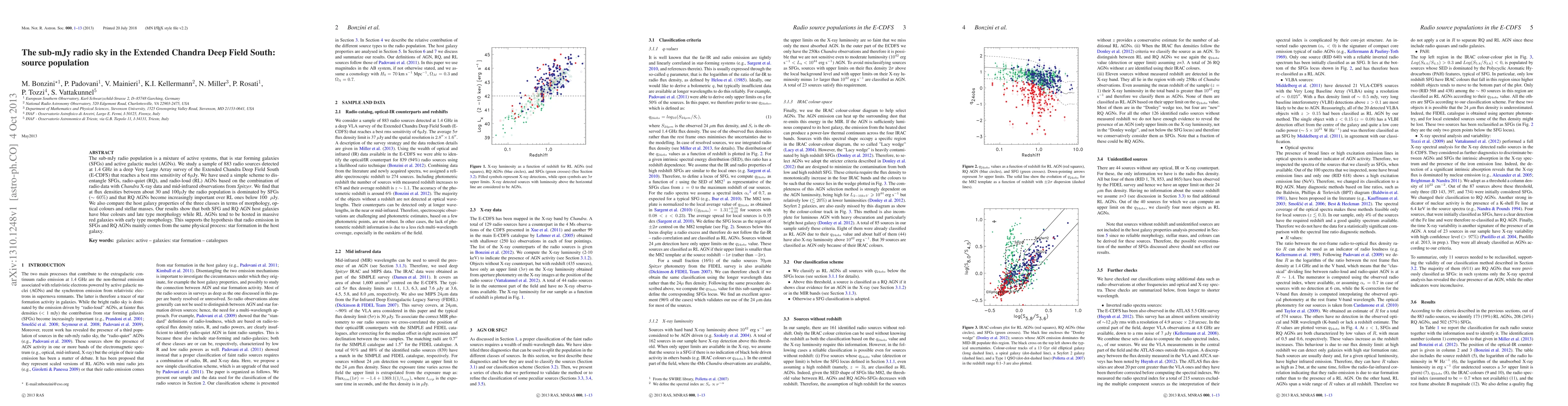 This study investigates the sub-mJy radio population in the Extended Chandra Deep Field South, identifying star-forming galaxies and active galactic nuclei. It finds that star-forming galaxies dominate the radio population at flux densities between 30 and 100 microJy, while radio-quiet AGNs become more significant than radio-loud AGNs at lower flux densities.