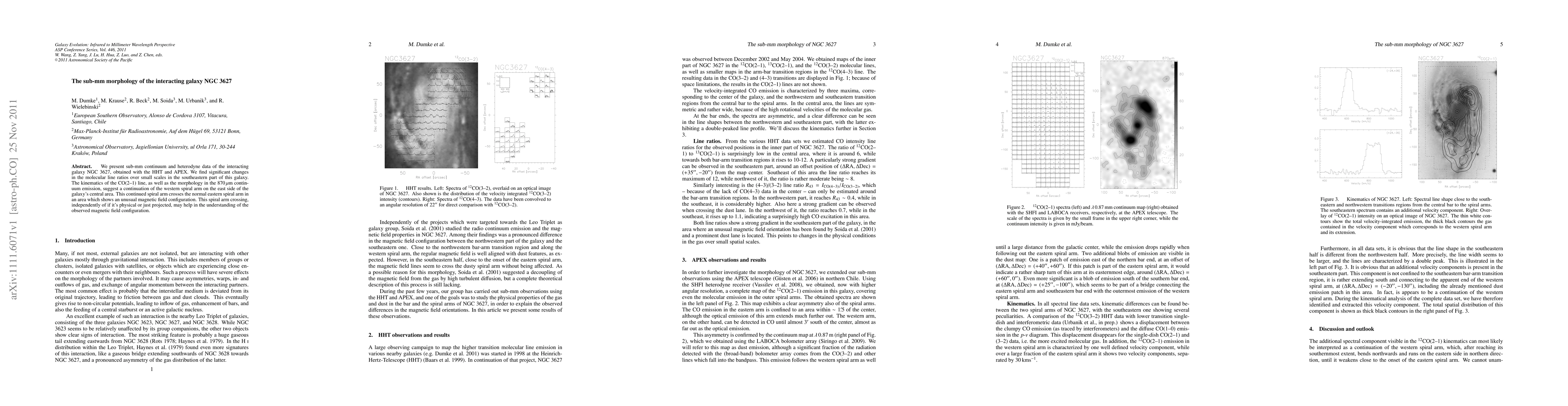 We present sub-mm continuum and heterodyne data of the interacting galaxy NGC 3627, obtained with the HHT and APEX. We find significant changes in the molecular line ratios over small scales in the southeastern part of this galaxy. The kinematics of the CO(2-1) line, as well as the morphology in the 870um continuum emission, suggest a continuation of the western spiral arm on the east side of the galaxy's central area. This continued spiral arm crosses the normal eastern spiral arm in an area which shows an unusual magnetic field configuration. This spiral arm crossing, independently of if it's physical or just projected, may help in the understanding of the observed magnetic field configuration.