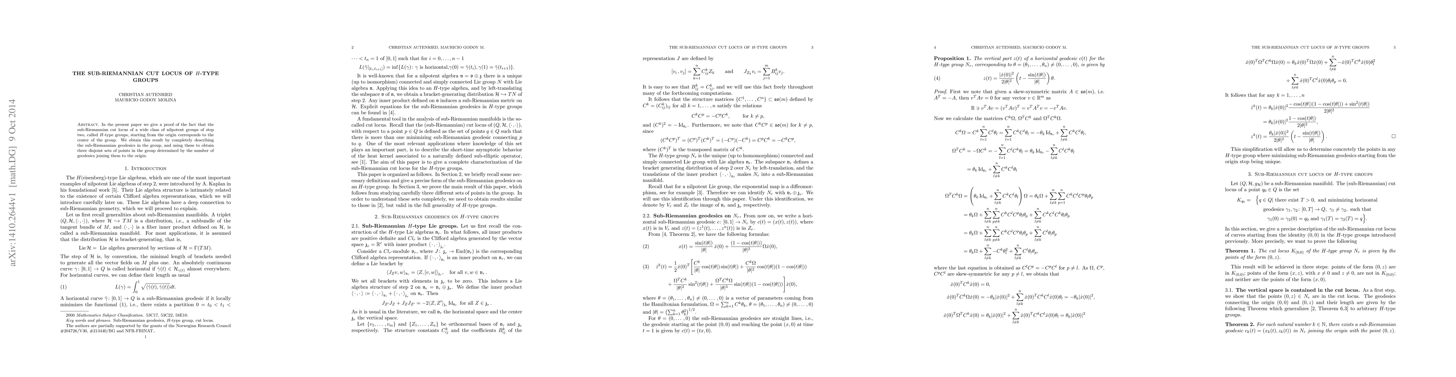 This paper proves that the sub-Riemannian cut locus for $H$-type groups, a class of nilpotent step two groups, originates from the group's center. The authors achieve this by thoroughly characterizing the sub-Riemannian geodesics and identifying three disjoint sets of points based on the number of geodesics connecting them to the origin.