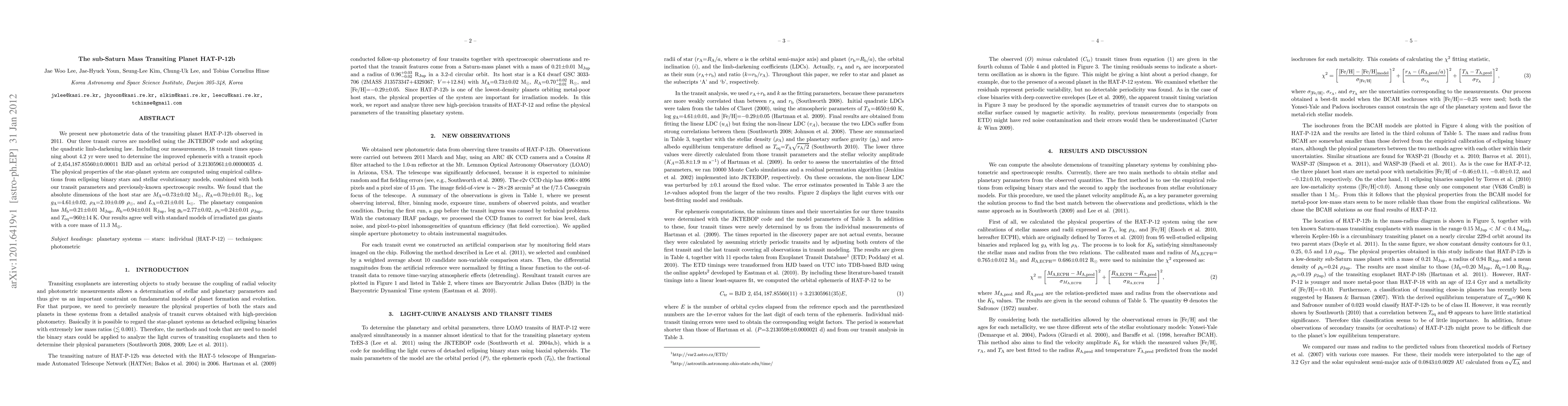 This paper reports new photometric data for the transiting sub-Saturn planet HAT-P-12b, refining its ephemeris and physical properties using updated transit observations and modeling. The study finds the planet to have a radius of 0.94 R_Jup and an equilibrium temperature of 960 K, consistent with models of irradiated gas giants.