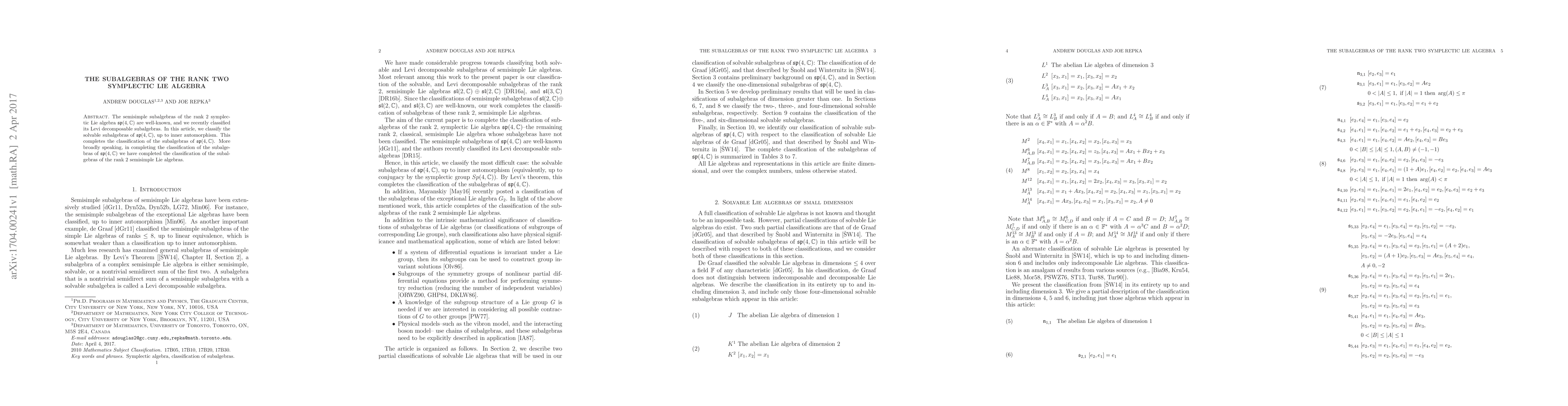 This paper classifies all solvable subalgebras of the rank two symplectic Lie algebra $\mathfrak{sp}(4,\mathbb{C})$, completing the classification of its subalgebras and thus also classifying subalgebras of all rank 2 semisimple Lie algebras.
