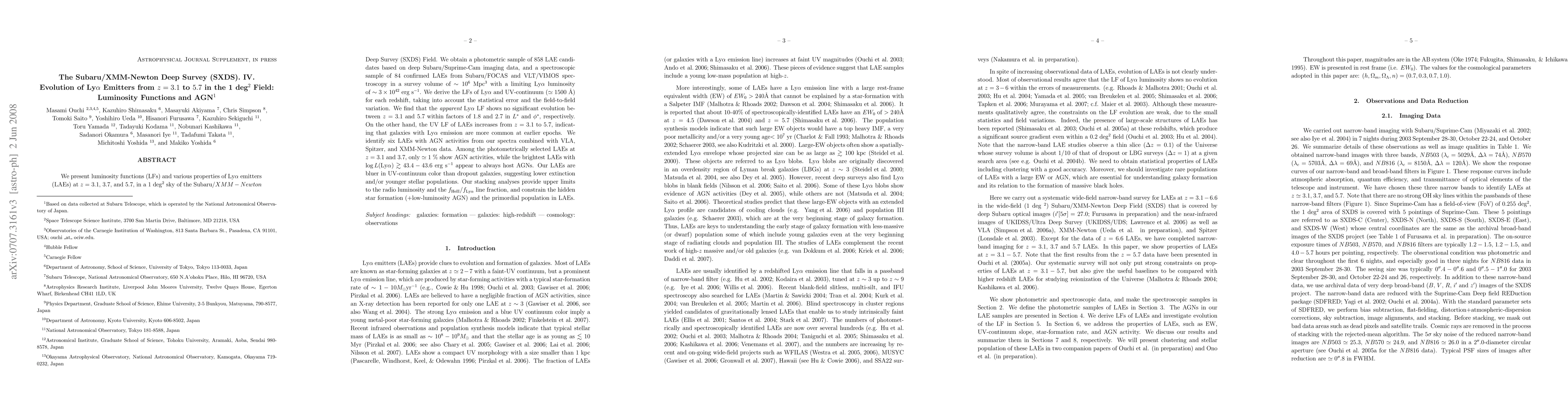 We present luminosity functions (LFs) and various properties of Lya emitters (LAEs) at z=3.1, 3.7, and 5.7, in a 1 deg^2 sky of the Subaru/XMM-Newton Deep Survey (SXDS) Field. We obtain a photometric sample of 858 LAE candidates based on deep Subaru/Suprime-Cam imaging data, and a spectroscopic sample of 84 confirmed LAEs from Subaru/FOCAS and VLT/VIMOS spectroscopy in a survey volume of ~10^6 Mpc^3 with a limiting Lya luminosity of ~3x10^42 erg/s. We derive the LFs of Lya and UV-continuum (~1500 \AA) for each redshift, taking into account the statistical error and the field-to-field variation. We find that the apparent Lya LF shows no significant evolution between z=3.1 and 5.7 within factors of 1.8 and 2.7 in L* and phi*, respectively. On the other hand, the UV LF of LAEs increases from z=3.1 to 5.7, indicating that galaxies with Lya emission are more common at earlier epochs. We identify six LAEs with AGN activities from our spectra combined with VLA, Spitzer, and XMM-Newton data. Among the photometrically selected LAEs at z=3.1 and 3.7, only ~1 % show AGN activities, while the brightest LAEs with logL(Lya) >~ 43.4-43.6 erg/s appear to always host AGNs. Our LAEs are bluer in UV-continuum color than dropout galaxies, suggesting lower extinction and/or younger stellar populations. Our stacking analyses provide upper limits to the radio luminosity and the f(HeII)/f(Lya) line fraction, and constrain the hidden star formation (+low-luminosity AGN) and the primordial population in LAEs.