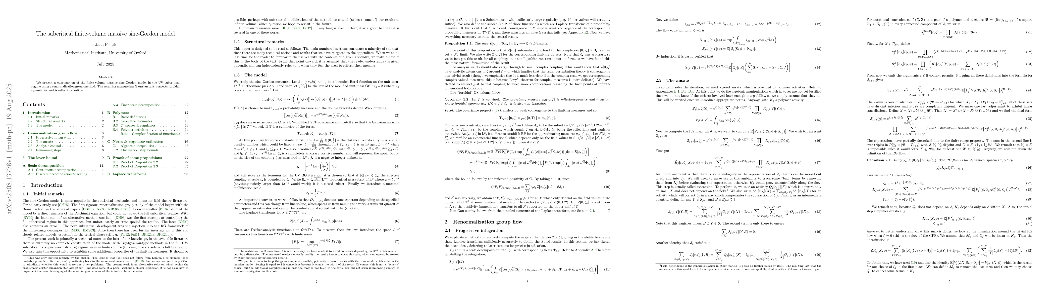 The paper details a renormalization group method to construct a finite-volume massive sine-Gordon model in the subcritical UV regime. The model respects symmetries and features Gaussian tails and reflection positivity.