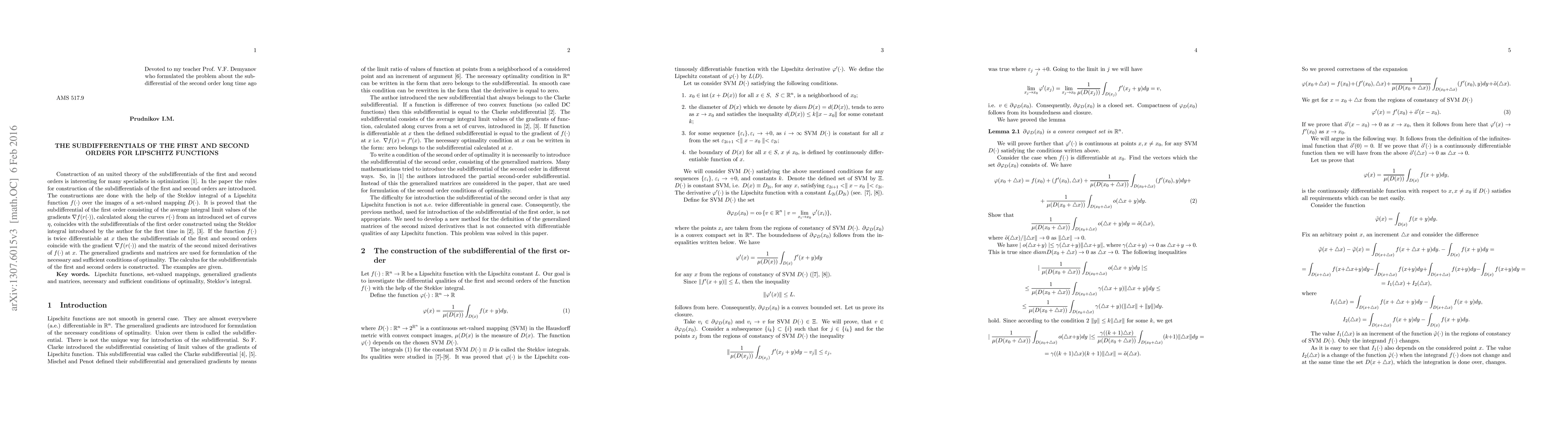 Construction of an united theory of the subdifferentials of the first and second orders is interesting for many specialists in optimization \cite{morduchrockafel}. In the paper the rules for construction of the subdifferentials of the first and second orders are introduced. The constructions are done with the help of the Steklov integral of a Lipschitz function $f(\cdot)$ over the images of a set-valued mapping $D(\cdot)$. It is proved that the subdifferential of the first order consisting of the average integral limit values of the gradients $\nabla f(r(\cdot))$, calculated along the curves $r(\cdot)$ from an introduced set of curves $\eta$, coincides with the subdifferentials of the first order constructed using the Steklov integral introduced by the author for the first time in \cite{lowapp2}, \cite{lowapp2a}. If the function $f(\cdot)$ is twice differentiable at $x$ then the subdifferentials of the first and second orders coincide with the gradient $\nabla f(r(\cdot))$ and the matrix of the second mixed derivatives of $f(\cdot)$ at $x$. The generalized gradients and matrices are used for formulation of the necessary and sufficient conditions of optimality. The calculus for the subdifferentials of the first and second orders is constructed. The examples are given.