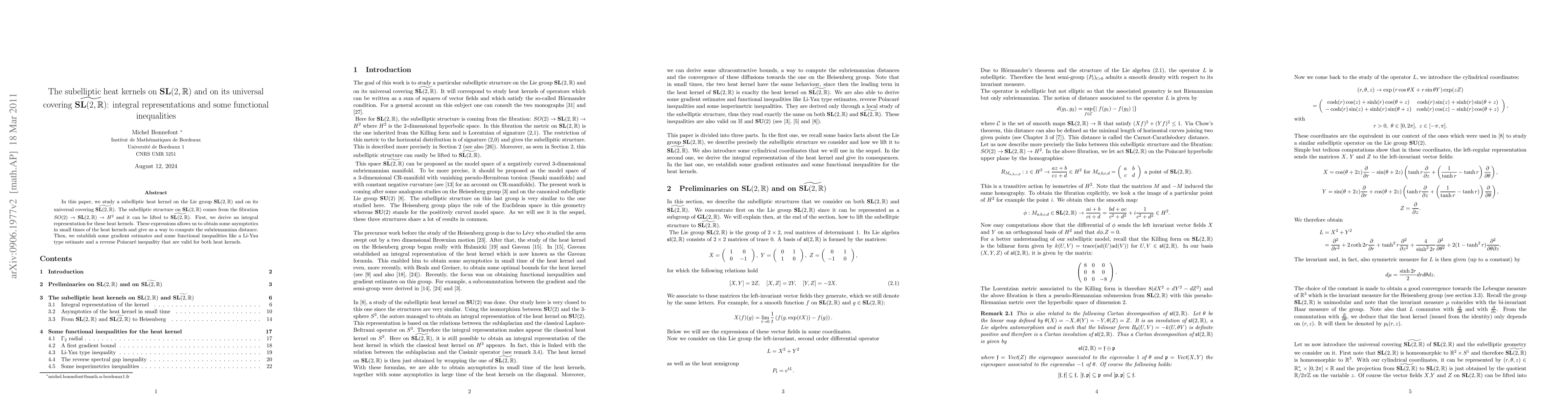In this paper, we study a subelliptic heat kernel on the Lie group SL(2,R) and on its universal covering. The subelliptic structure on SL(2,R) comes from the fibration $SO(2) -> SL(2,R) -> H^2$ and it can be lifted to its universal covering. First, we derive an integral representation for these heat kernels. These expressions allow us to obtain some asymptotics in small time of the heat kernels and give us a way to compute the subriemannian distances. Then, we establish some gradient estimates and some functional inequalities like a Li-Yau type estimate and a reverse Poincar\'e inequality that are valid for both heat kernels.