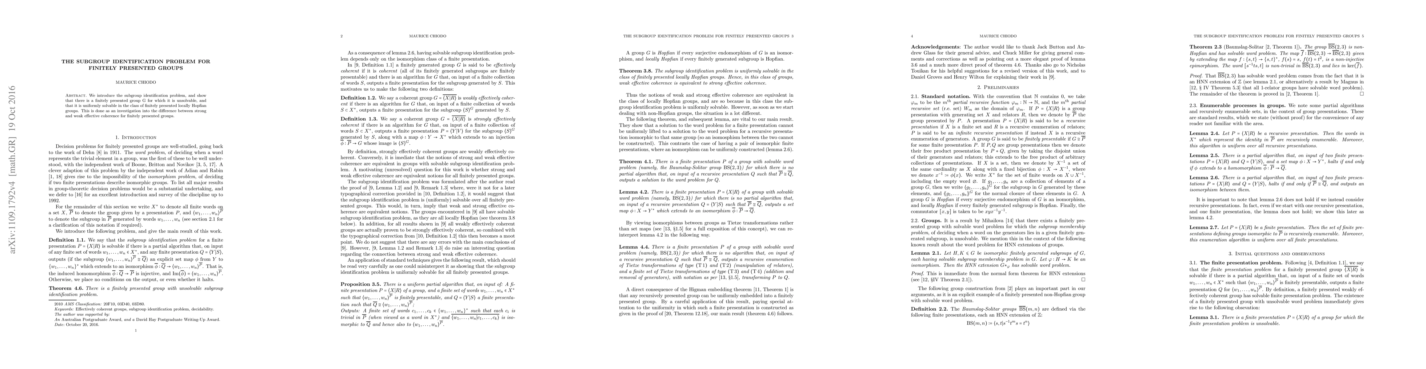 We introduce the subgroup identification problem, and show that there is a finitely presented group G for which it is unsolvable, and that it is uniformly solvable in the class of finitely presented locally Hopfian groups. This is done as an investigation into the difference between strong and weak effective coherence for finitely presented groups.