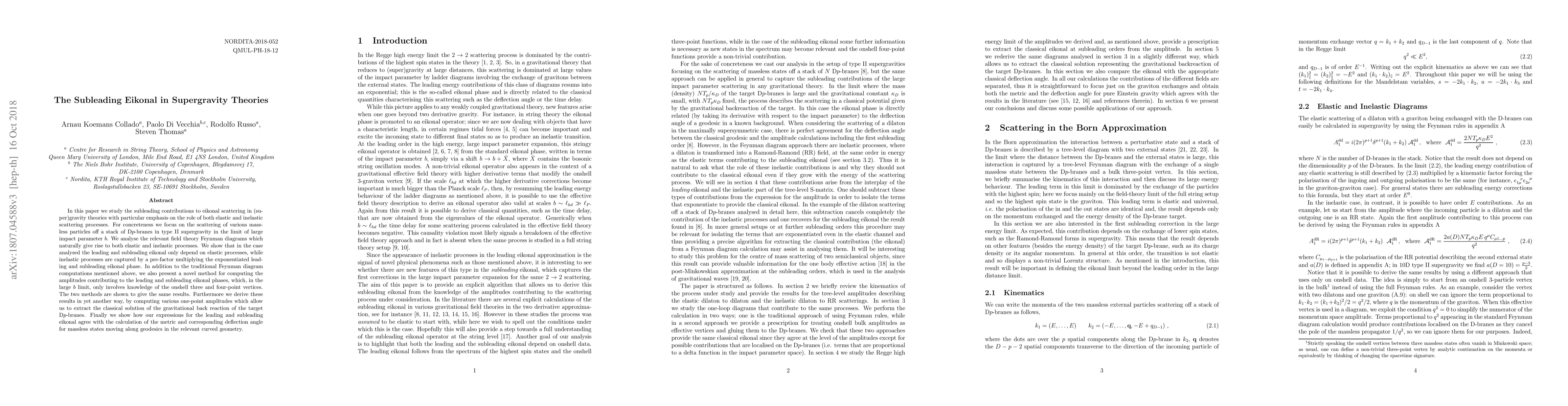 In this paper we study the subleading contributions to eikonal scattering in (super)gravity theories with particular emphasis on the role of both elastic and inelastic scattering processes. For concreteness we focus on the scattering of various massless particles off a stack of D$p$-branes in type II supergravity in the limit of large impact parameter $b$. We analyse the relevant field theory Feynman diagrams which naturally give rise to both elastic and inelastic processes. We show that in the case analysed the leading and subleading eikonal only depend on elastic processes, while inelastic processes are captured by a pre-factor multiplying the exponentiated leading and subleading eikonal phase. In addition to the traditional Feynman diagram computations mentioned above, we also present a novel method for computing the amplitudes contributing to the leading and subleading eikonal phases, which, in the large $b$ limit, only involves knowledge of the onshell three and four-point vertices. The two methods are shown to give the same results. Furthermore we derive these results in yet another way, by computing various one-point amplitudes which allow us to extract the classical solution of the gravitational back reaction of the target D$p$-branes. Finally we show how our expressions for the leading and subleading eikonal agree with the calculation of the metric and corresponding deflection angle for massless states moving along geodesics in the relevant curved geometry.