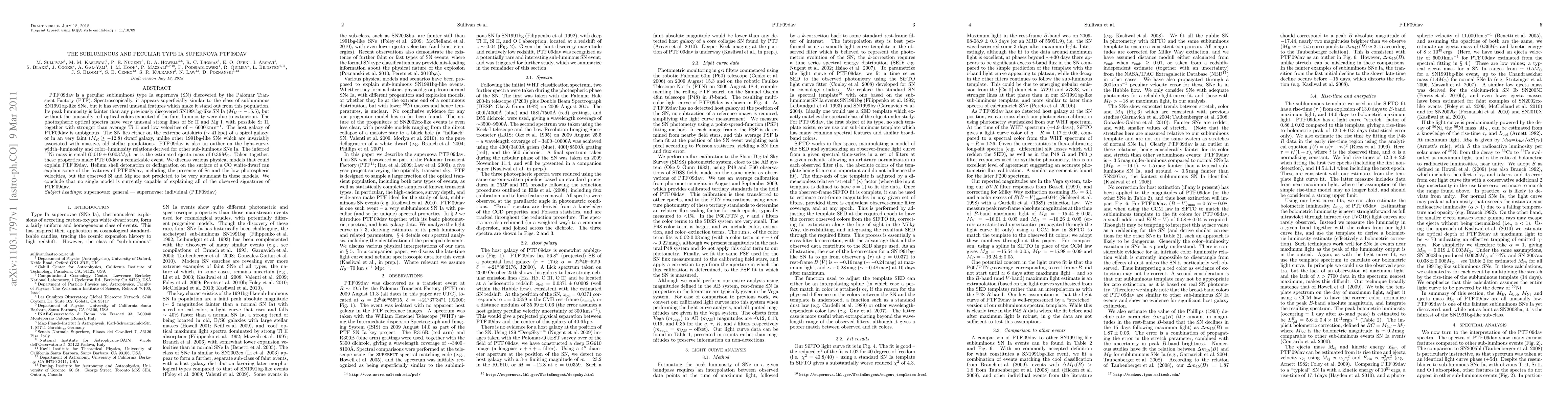 PTF09dav is a peculiar subluminous type Ia supernova (SN) discovered by the Palomar Transient Factory (PTF). Spectroscopically, it appears superficially similar to the class of subluminous SN1991bg-like SNe, but it has several unusual features which make it stand out from this population. Its peak luminosity is fainter than any previously discovered SN1991bg-like SN Ia (M_B -15.5), but without the unusually red optical colors expected if the faint luminosity were due to extinction. The photospheric optical spectra have very unusual strong lines of Sc II and Mg I, with possible Sr II, together with stronger than average Ti II and low velocities of ~6000 km/s. The host galaxy of PTF09dav is ambiguous. The SN lies either on the extreme outskirts (~41kpc) of a spiral galaxy, or in an very faint (M_R>-12.8) dwarf galaxy, unlike other 1991bg-like SNe which are invariably associated with massive, old stellar populations. PTF09dav is also an outlier on the light-curve-width--luminosity and color--luminosity relations derived for other sub-luminous SNe Ia. The inferred 56Ni mass is small (0.019+/-0.003Msun), as is the estimated ejecta mass of 0.36Msun. Taken together, these properties make PTF09dav a remarkable event. We discuss various physical models that could explain PTF09dav. Helium shell detonation or deflagration on the surface of a CO white-dwarf can explain some of the features of PTF09dav, including the presence of Sc and the low photospheric velocities, but the observed Si and Mg are not predicted to be very abundant in these models. We conclude that no single model is currently capable of explaining all of the observed signatures of PTF09dav.