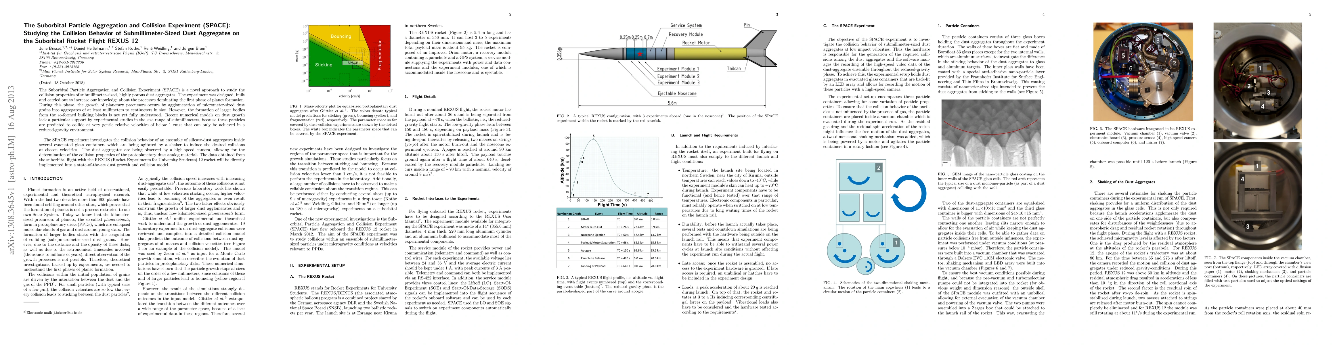 The Suborbital Particle Aggregation and Collision Experiment (SPACE) is a novel approach to study the collision properties of submillimeter-sized, highly porous dust aggregates. The experiment was designed, built and carried out to increase our knowledge about the processes dominating the first phase of planet formation. During this phase, the growth of planetary precursors occurs by agglomeration of micrometer-sized dust grains into aggregates of at least millimeters to centimeters in size. However, the formation of larger bodies from the so-formed building blocks is not yet fully understood. Recent numerical models on dust growth lack a particular support by experimental studies in the size range of submillimeters, because these particles are predicted to collide at very gentle relative velocities of below 1 cm/s that can only be achieved in a reduced-gravity environment. The SPACE experiment investigates the collision behavior of an ensemble of silicate-dust aggregates inside several evacuated glass containers which are being agitated by a shaker to induce the desired collisions at chosen velocities. The dust aggregates are being observed by a high-speed camera, allowing for the determination of the collision properties of the protoplanetary dust analog material. The data obtained from the suborbital flight with the REXUS (Rocket Experiments for University Students) 12 rocket will be directly implemented into a state-of-the-art dust growth and collision model.
