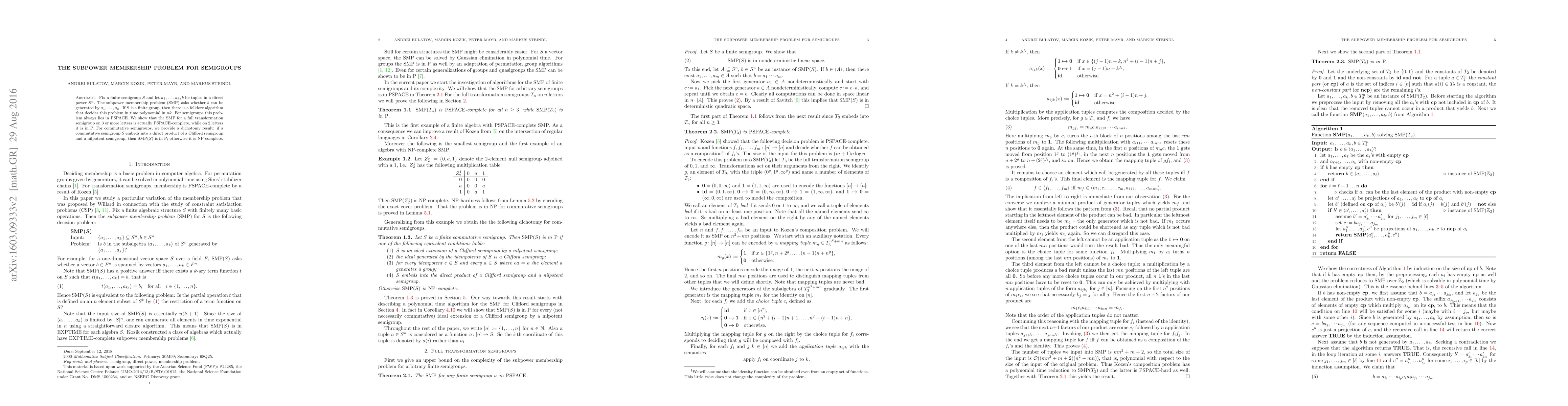 This research investigates the subpower membership problem (SMP) for finite semigroups, showing it is PSPACE-complete for full transformation semigroups on 3 or more letters and in P for 2 letters. For commutative semigroups, it establishes that SMP is in P if the semigroup embeds into a Clifford-nilpotent product, otherwise it is NP-complete.