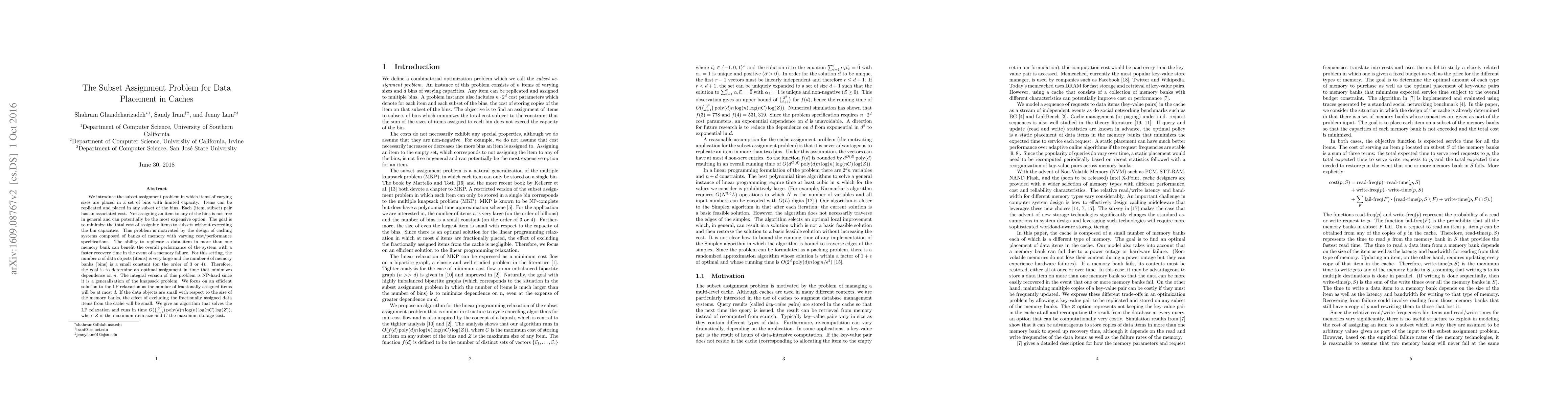 We introduce the subset assignment problem in which items of varying sizes are placed in a set of bins with limited capacity. Items can be replicated and placed in any subset of the bins. Each (item, subset) pair has an associated cost. Not assigning an item to any of the bins is not free in general and can potentially be the most expensive option. The goal is to minimize the total cost of assigning items to subsets without exceeding the bin capacities. This problem is motivated by the design of caching systems composed of banks of memory with varying cost/performance specifications. The ability to replicate a data item in more than one memory bank can benefit the overall performance of the system with a faster recovery time in the event of a memory failure. For this setting, the number $n$ of data objects (items) is very large and the number $d$ of memory banks (bins) is a small constant (on the order of $3$ or $4$). Therefore, the goal is to determine an optimal assignment in time that minimizes dependence on $n$. The integral version of this problem is NP-hard since it is a generalization of the knapsack problem. We focus on an efficient solution to the LP relaxation as the number of fractionally assigned items will be at most $d$. If the data objects are small with respect to the size of the memory banks, the effect of excluding the fractionally assigned data items from the cache will be small. We give an algorithm that solves the LP relaxation and runs in time $O({3^d \choose d+1} \text{poly}(d) n \log(n) \log(nC) \log(Z))$, where $Z$ is the maximum item size and $C$ the maximum storage cost.