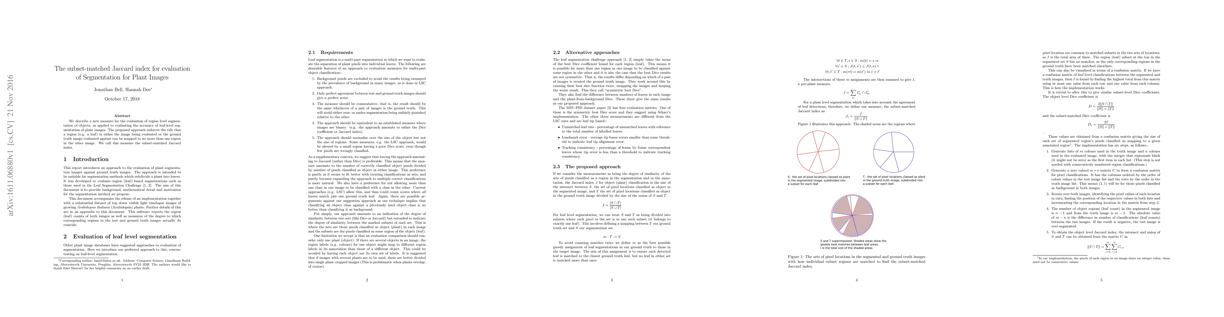 We describe a new measure for the evaluation of region level segmentation of objects, as applied to evaluating the accuracy of leaf-level segmentation of plant images. The proposed approach enforces the rule that a region (e.g. a leaf) in either the image being evaluated or the ground truth image evaluated against can be mapped to no more than one region in the other image. We call this measure the subset-matched Jaccard index.