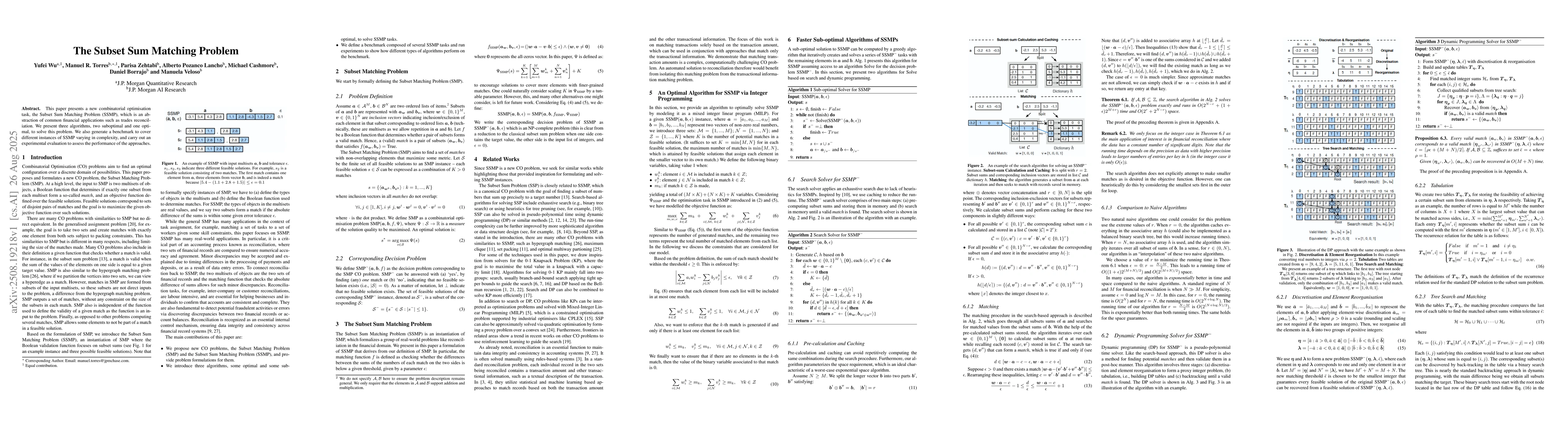 This paper presents a new combinatorial optimisation task, the Subset Sum Matching Problem (SSMP), which is an abstraction of common financial applications such as trades reconciliation. We present three algorithms, two suboptimal and one optimal, to solve this problem. We also generate a benchmark to cover different instances of SSMP varying in complexity, and carry out an experimental evaluation to assess the performance of the approaches.