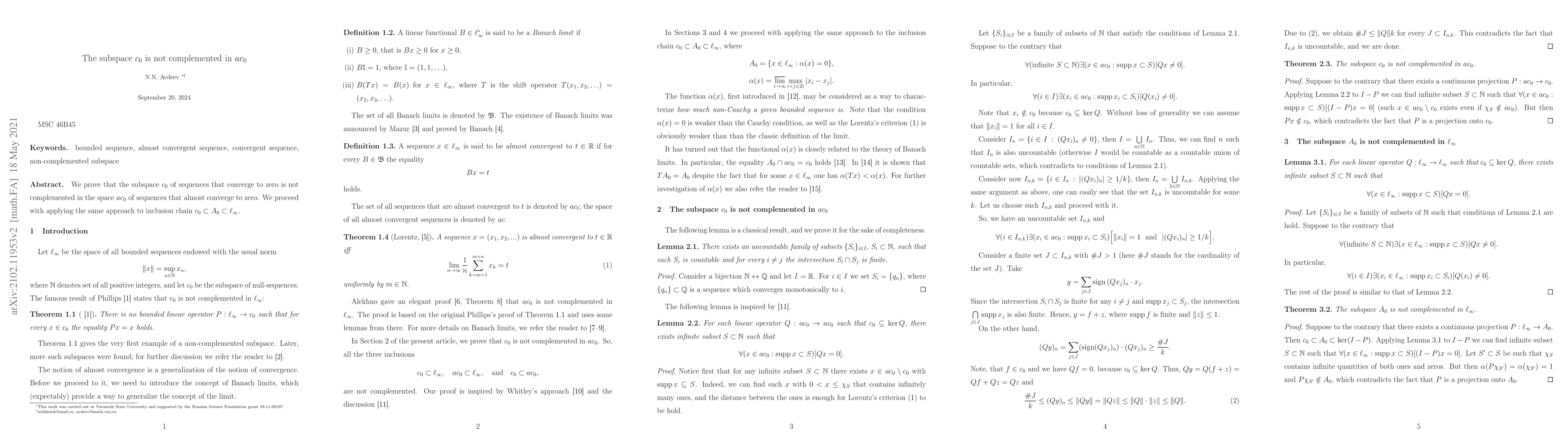 We prove that the subspace $c_0$ of sequences that converge to zero is not complemented in the space $ac_0$ of sequences that almost converge to zero. We proceed with applying the same approach to inclusion chain $c_0\subset A_0 \subset \ell_\infty$.