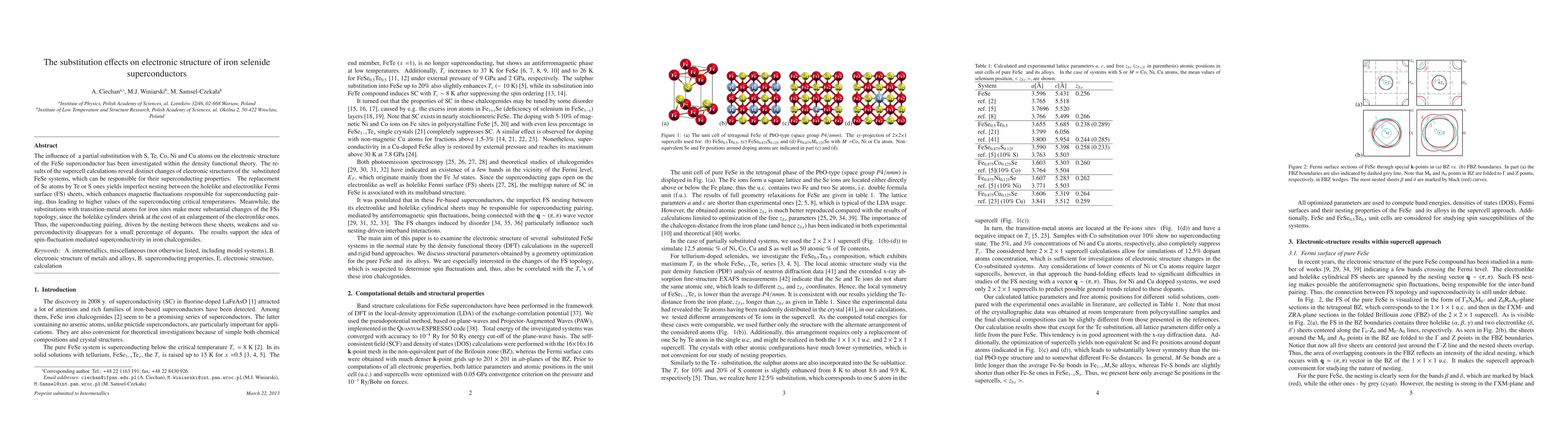 This study investigates the impact of substituting S, Te, Co, Ni, and Cu atoms on the electronic structure of FeSe superconductors using density functional theory. The findings show that Se substitution with Te or S disrupts nesting between Fermi surface sheets, enhancing magnetic fluctuations and increasing superconducting critical temperatures, while substitutions at iron sites alter Fermi surface topology, weakening superconducting pairing and diminishing superconductivity.