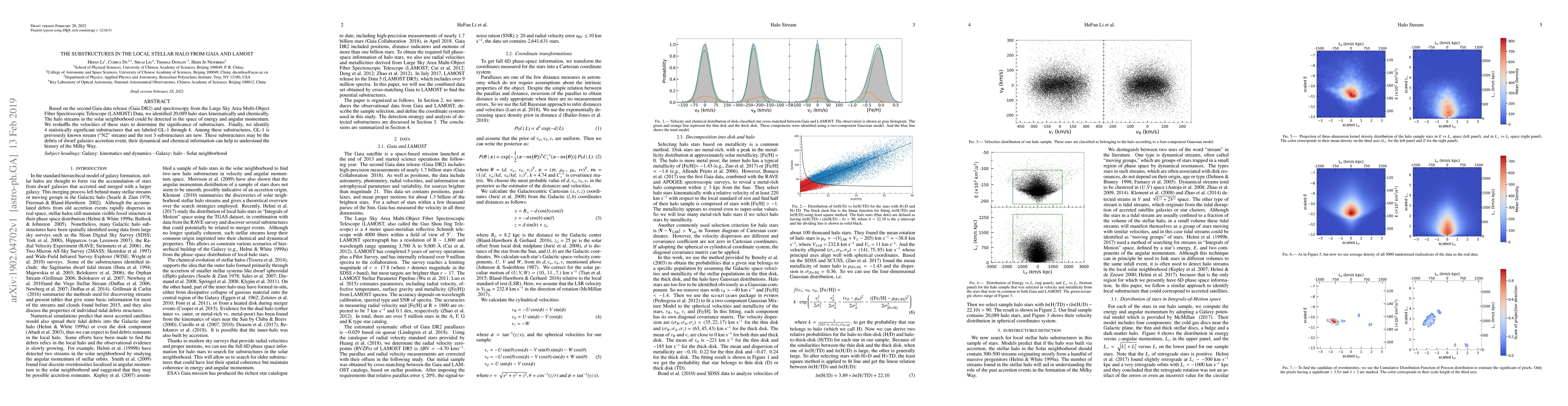 This paper identifies 4 statistically significant substructures in the local stellar halo using Gaia DR2 and LAMOST data, including the previously known "N2" stream and 3 new substructures, suggesting they may be remnants of dwarf galaxy accretion events. These findings provide insights into the Milky Way's formation history.