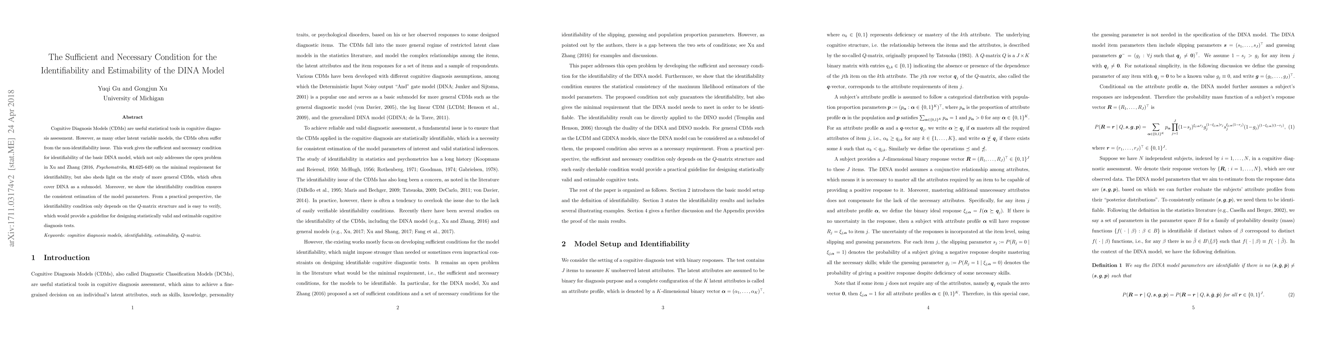 This paper establishes the sufficient and necessary condition for the identifiability of the DINA model, a type of Cognitive Diagnosis Model, addressing the non-identifiability issue prevalent in latent variable models. The condition ensures consistent parameter estimation and is practical as it is based on the structure of the Q-matrix, offering a guideline for designing valid cognitive diagnosis tests.