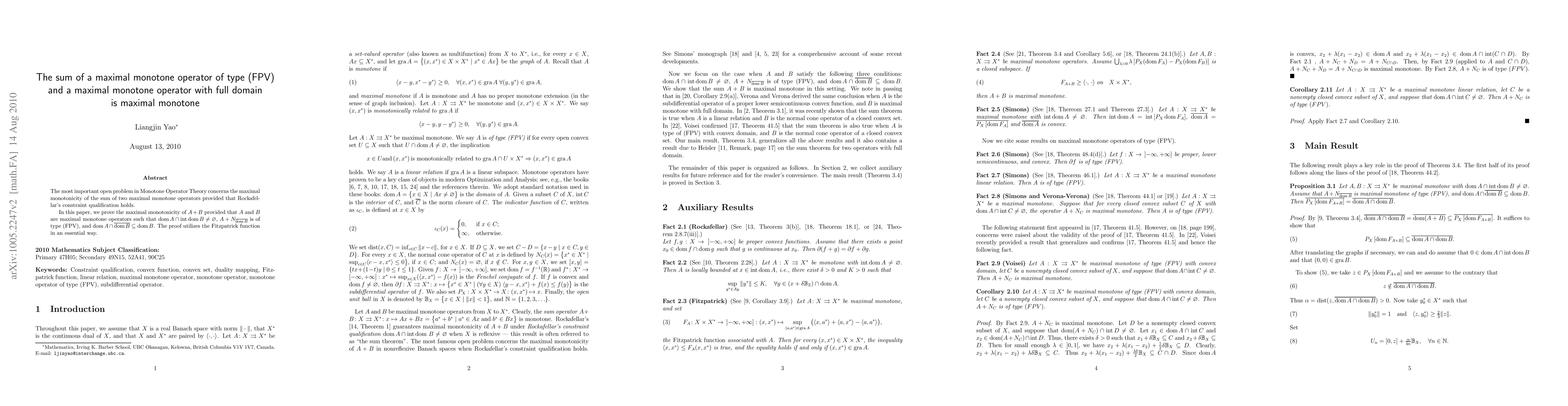The paper proves that the sum of two maximal monotone operators A and B is maximal monotone under certain conditions, including Rockafellar's constraint qualification and specific domain restrictions.