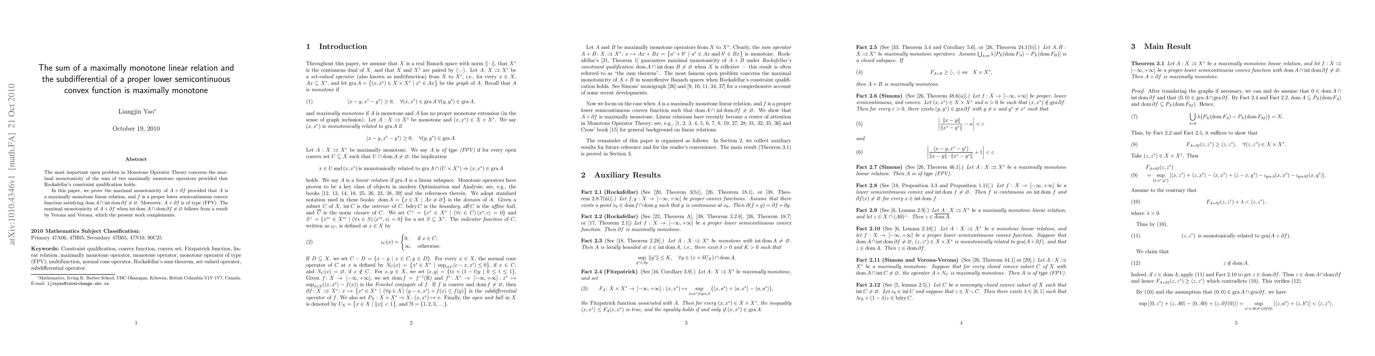 This paper proves the maximal monotonicity of the sum of a maximally monotone linear relation $A$ and the subdifferential $\partial f$ of a proper lower semicontinuous convex function $f$, under certain domain intersection conditions. It complements prior work by Verona and Verona, addressing the open problem in Monotone Operator Theory.