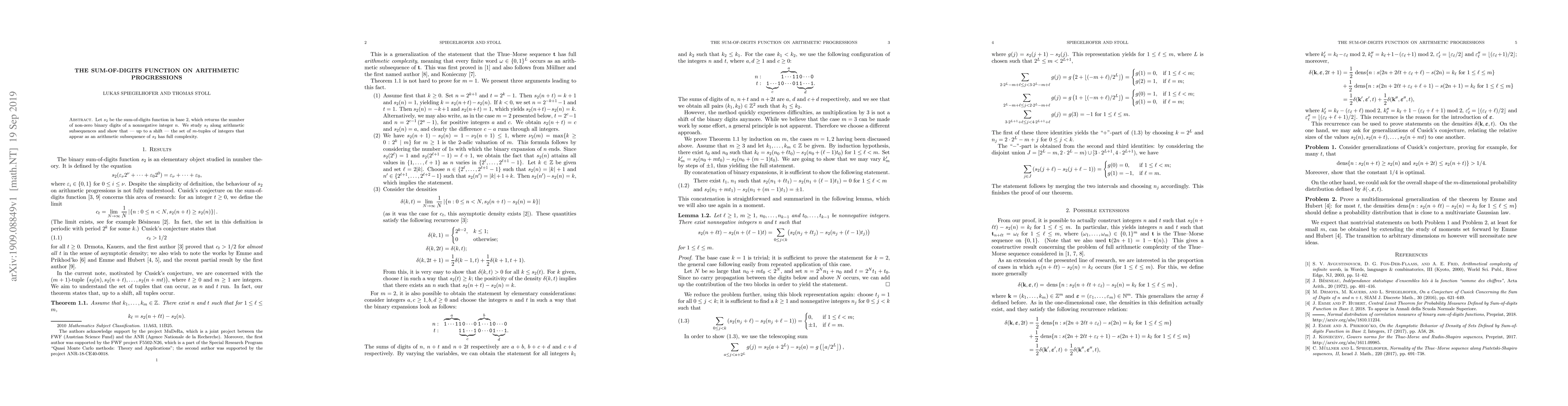 This paper investigates the sum-of-digits function $s_2$ in base 2 along arithmetic subsequences, demonstrating that the set of $m$-tuples appearing as such subsequences exhibits full complexity, up to a shift.