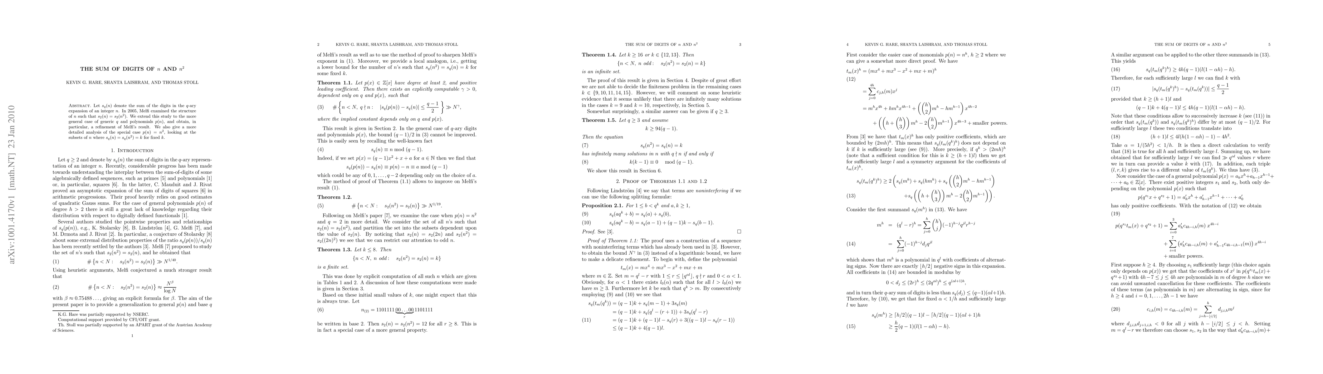 Let $s_q(n)$ denote the sum of the digits in the $q$-ary expansion of an integer $n$. In 2005, Melfi examined the structure of $n$ such that $s_2(n) = s_2(n^2)$. We extend this study to the more general case of generic $q$ and polynomials $p(n)$, and obtain, in particular, a refinement of Melfi's result. We also give a more detailed analysis of the special case $p(n) = n^2$, looking at the subsets of $n$ where $s_q(n) = s_q(n^2) = k$ for fixed $k$.
