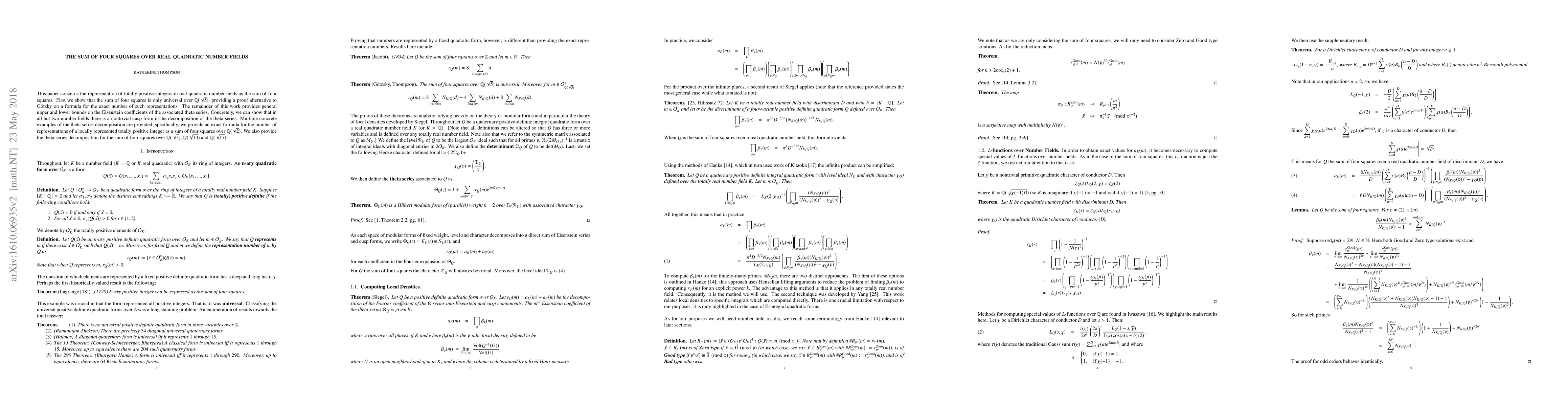Well-known results of Lagrange and Jacobi prove that the every $m \in \mathbb N$ can be expressed as a sum of four integer squares, and the number $r(m)$ of such representations can be given by an explicit formula in $m$. In this paper, we prove that the only real quadratic number field for which the sum of four squares is universal is $\mathbb Q(\sqrt{5})$. We provide explicit formulas for $r(m)$ for $K= \mathbb Q (\sqrt{2})$ and $K= \mathbb Q(\sqrt{5})$. We then consider the theta series of the sum of four squares over any real quadratic number field, providing explicit upper and lower bounds for the Eisenstein coefficients. Last, we include examples of the complete theta series decomposition of the sum of four squares over $\mathbb Q (\sqrt{3})$, $\mathbb Q (\sqrt{13})$ and $\mathbb Q (\sqrt{17})$.