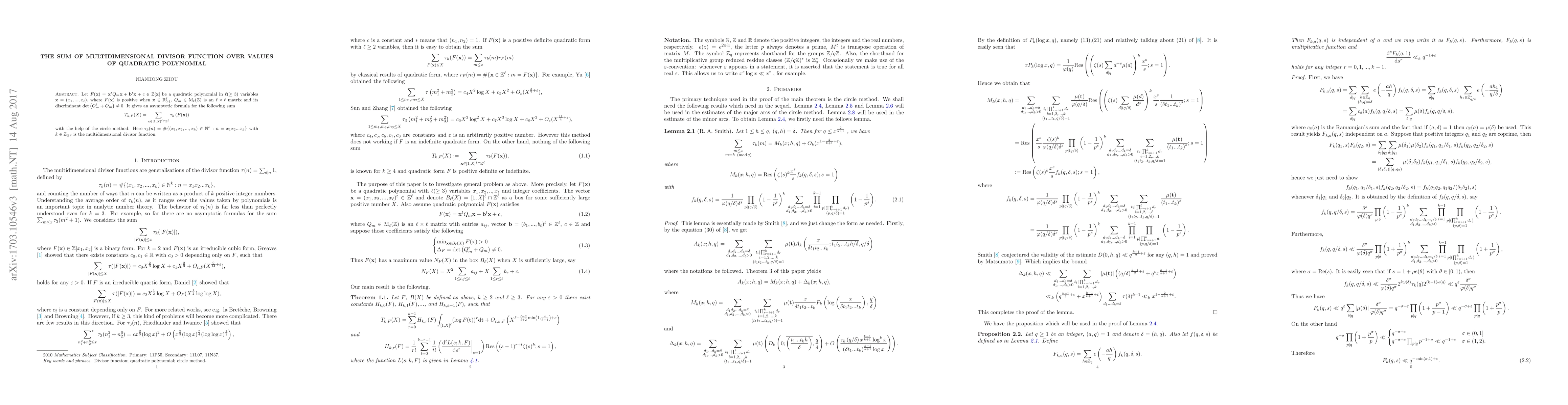 This paper presents an asymptotic formula for a sum involving the multidimensional divisor function over values of quadratic polynomials, using the circle method. It provides explicit formulas with help from the discriminant of the matrix Q_m.