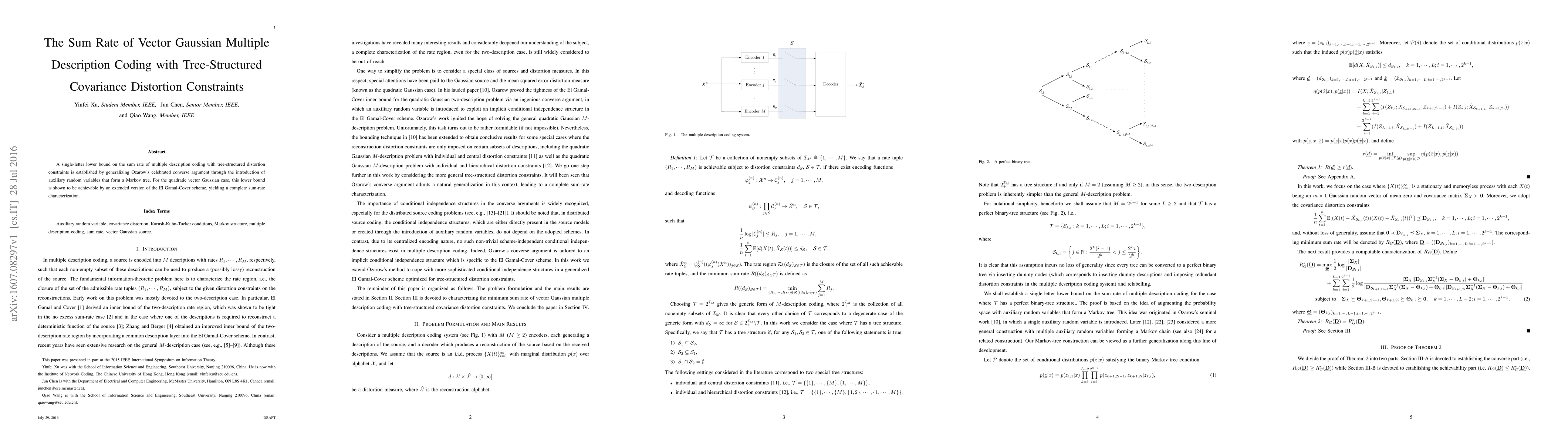 A single-letter lower bound on the sum rate of multiple description coding with tree-structured distortion constraints is established by generalizing Ozarow's celebrated converse argument through the introduction of auxiliary random variables that form a Markov tree. For the quadratic vector Gaussian case, this lower bound is shown to be achievable by an extended version of the El Gamal-Cover scheme, yielding a complete sum-rate characterization.