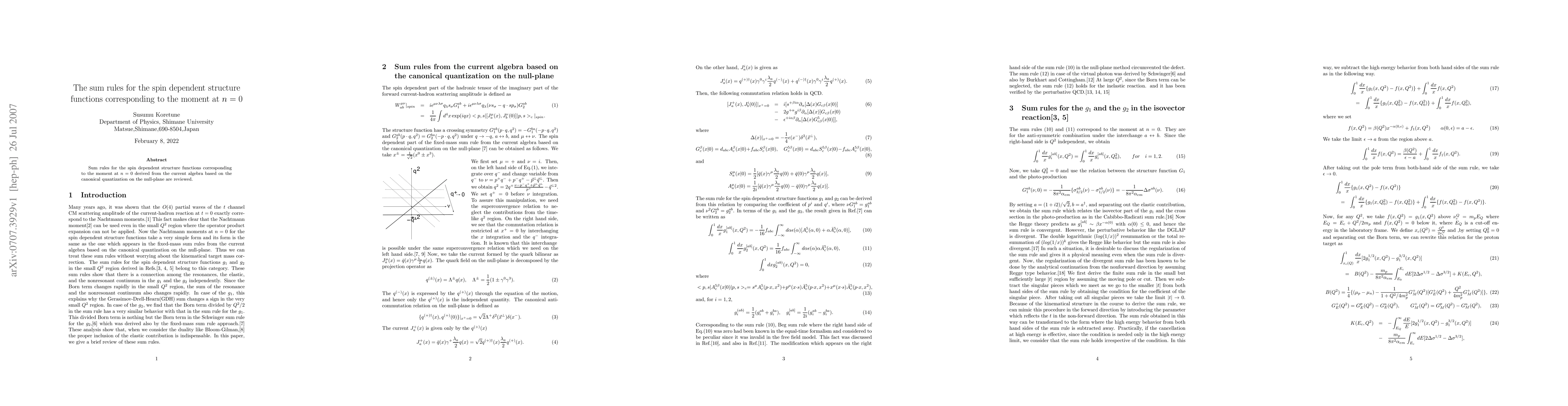 Sum rules for the spin dependent structure functions corresponding to the moment at $n=0$ derived from the current algebra based on the canonical quantization on the null-plane are reviewed.