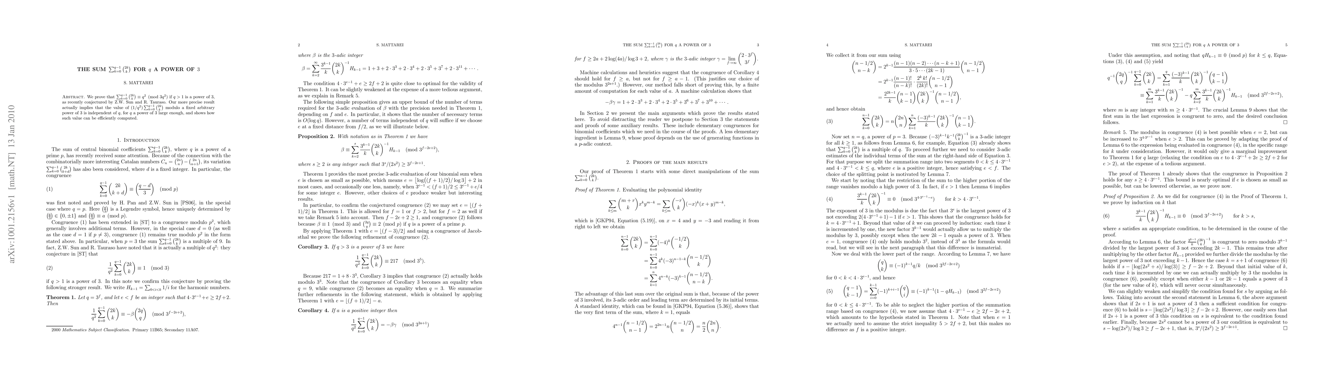 This paper proves that for q a power of 3, the sum $\sum_{k=0}^{q-1}\binom{2k}{k}$ is congruent to $q^2$ modulo $3q^2$. It also demonstrates that the normalized sum modulo any arbitrary power of 3 is independent of q for sufficiently large q.
