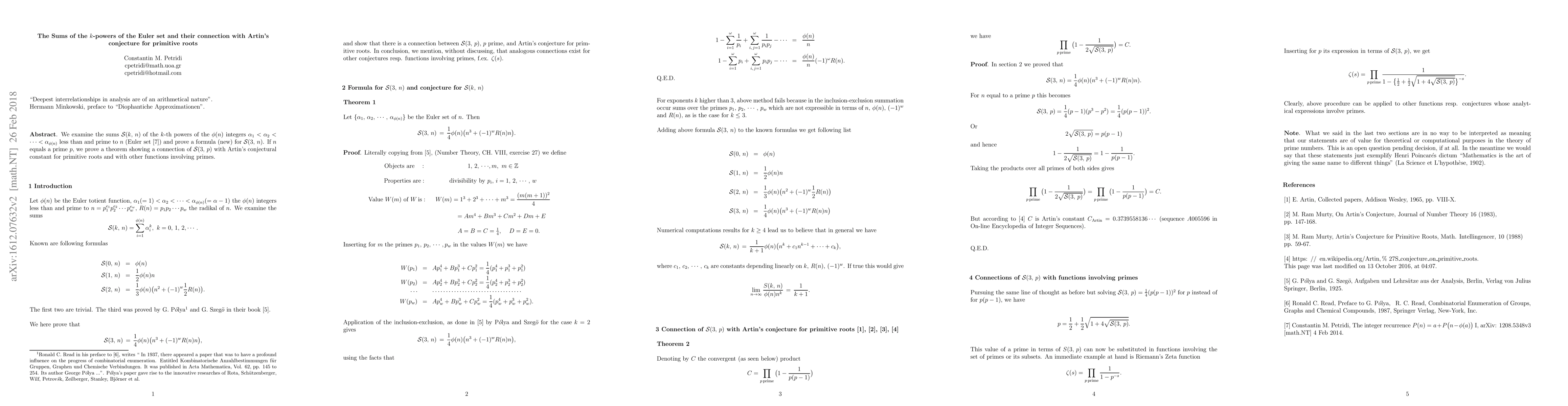 We examine the sums $S(k,\,n)$ of the $k-$th powers of the $\phi(n)$ integers $\alpha_1<\alpha_2<\cdots<\alpha_{\phi(n)}$ less than and prime to $n$ (Euler set) and prove a formula (new) for $S(3,\,n)$. If $n$ equals a prime $p$, we prove a theorem showing a connection of $S(3,\,p)$ with Artin's conjectural constant for primitive roots and with other functions involving primes.