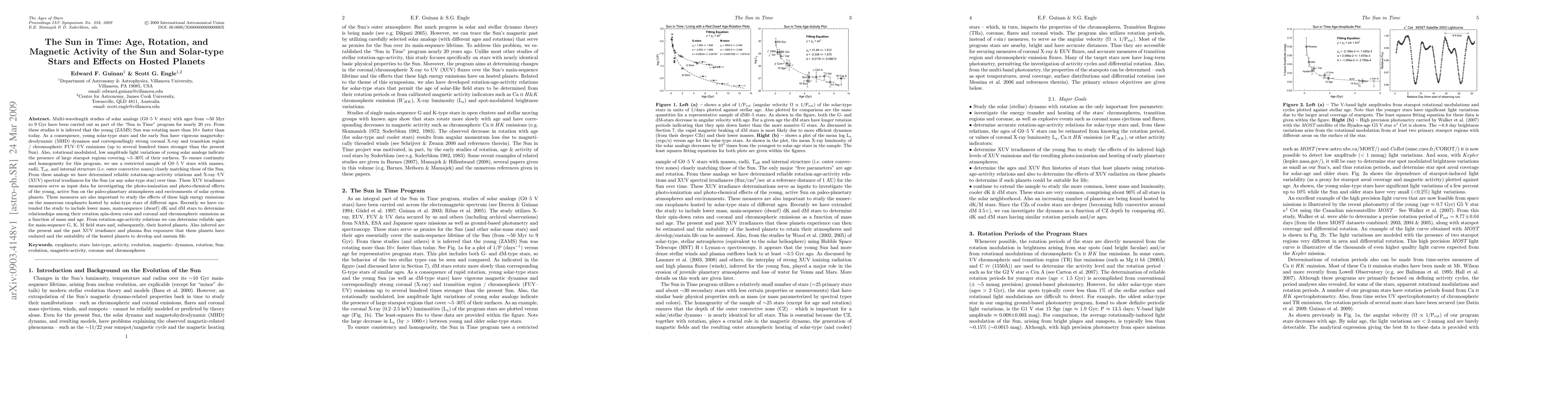 Multi-wavelength studies of solar analogs (G0-5 V stars) with ages from ~50 Myr to 9 Gyr have been carried out as part of the "Sun in Time" program for nearly 20 yrs. From these studies it is inferred that the young (ZAMS) Sun was rotating more than 10x faster than today. As a consequence, young solar-type stars and the early Sun have vigorous magnetohydrodynamic (MHD) dynamos and correspondingly strong coronal X-ray and transition region / chromospheric FUV-UV emissions. To ensure continuity and homogeneity for this program, we use a restricted sample of G0-5 V stars with masses, radii, T(eff), and internal structure (i.e. outer convective zones) closely matching those of the Sun. From these analogs we have determined reliable rotation-age-activity relations and X-ray - UV (XUV) spectral irradiances for the Sun (or any solar-type star) over time. These XUV irradiance measures serve as input data for investigating the photo-ionization and photo-chemical effects of the young, active Sun on the paleo-planetary atmospheres and environments of solar system planets. These measures are also important to study the effects of these high energy emissions on the numerous exoplanets hosted by solar-type stars of different ages. Recently we have extended the study to include lower mass, main-sequence (dwarf) dK and dM stars to determine relationships among their rotation spin-down rates and coronal and chromospheric emissions as a function of mass and age. From rotation-age-activity relations we can determine reliable ages for main-sequence G, K, M field stars and, subsequently, their hosted planets. Also inferred are the present and the past XUV irradiance and plasma flux exposures that these planets have endured and the suitability of the hosted planets to develop and sustain life.