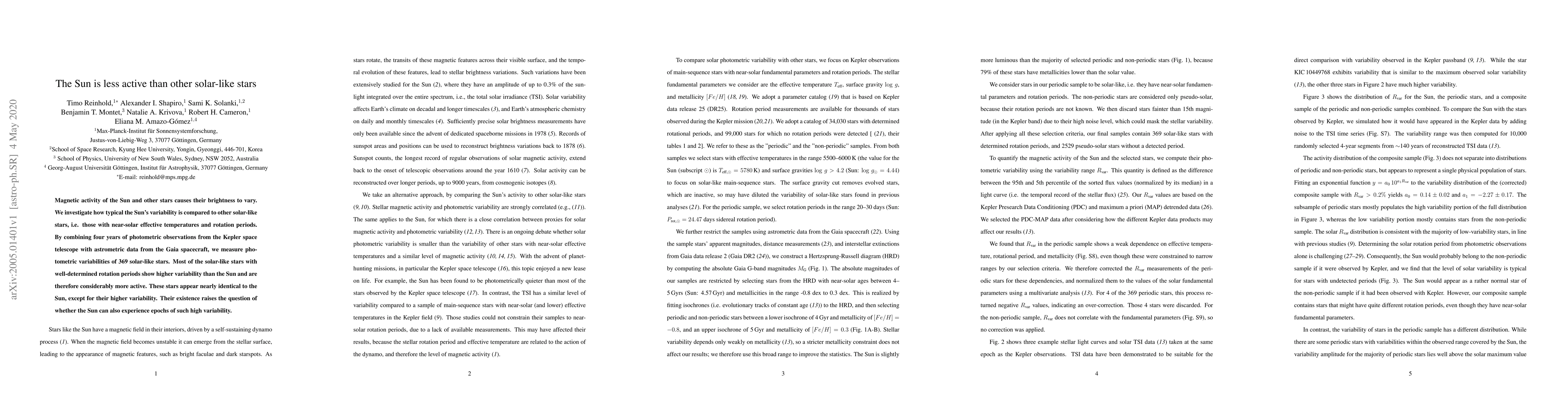 Magnetic activity of the Sun and other stars causes their brightness to vary. We investigate how typical the Sun's variability is compared to other solar-like stars, i.e. those with near-solar effective temperatures and rotation periods. By combining four years of photometric observations from the Kepler space telescope with astrometric data from the Gaia spacecraft, we measure photometric variabilities of 369 solar-like stars. Most of the solar-like stars with well-determined rotation periods show higher variability than the Sun and are therefore considerably more active. These stars appear nearly identical to the Sun, except for their higher variability. Their existence raises the question of whether the Sun can also experience epochs of such high variability.