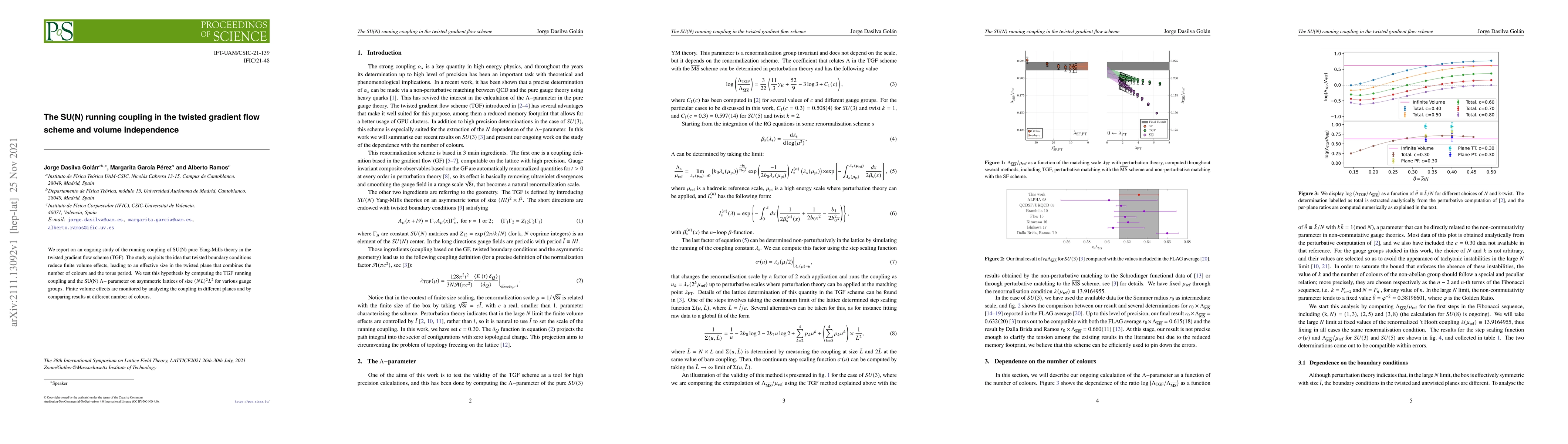 We report on an ongoing study of the running coupling of SU(N) pure Yang-Mills theory in the twisted gradient flow scheme (TGF). The study exploits the idea that twisted boundary conditions reduce finite volume effects, leading to an effective size in the twisted plane that combines the number of colours and the torus period. We test this hypothesis by computing the TGF running coupling and the SU(N) $\Lambda-$ parameter on asymmetric lattices of size $(NL)^2L^2$ for various gauge groups. Finite volume effects are monitored by analyzing the coupling in different planes and by comparing results at different number of colours.