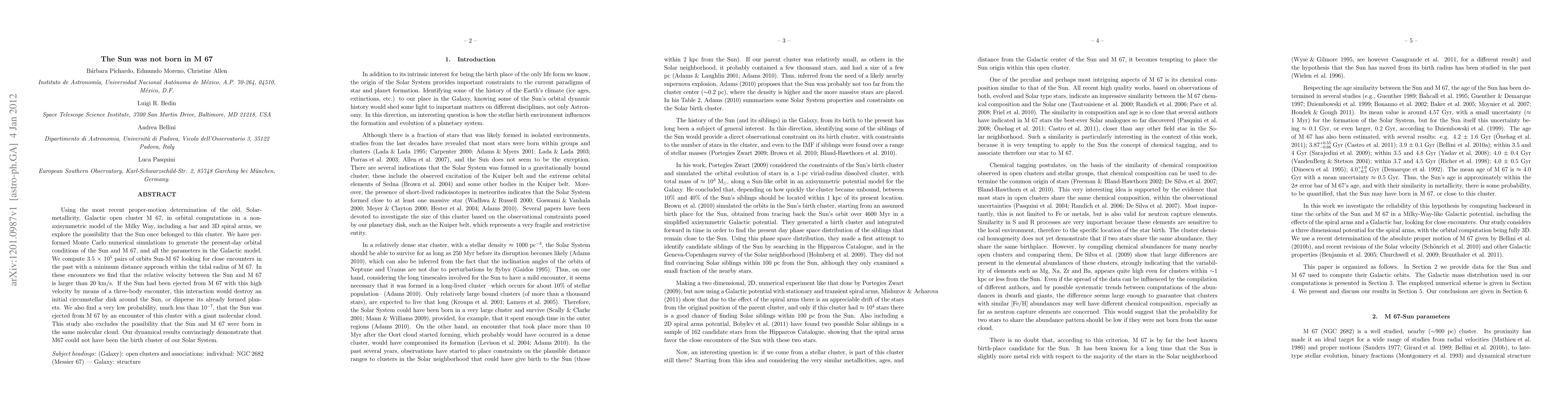 Using the most recent proper-motion determination of the old, Solar-metallicity, Galactic open cluster M 67, in orbital computations in a non-axisymmetric model of the Milky Way, including a bar and 3D spiral arms, we explore the possibility that the Sun once belonged to this cluster. We have performed Monte Carlo numerical simulations to generate the present-day orbital conditions of the Sun and M 67, and all the parameters in the Galactic model. We compute 3.5 \times 10^5 pairs of orbits Sun-M 67 looking for close encounters in the past with a minimum distance approach within the tidal radius of M 67. In these encounters we find that the relative velocity between the Sun and M 67 is larger than 20 km/s. If the Sun had been ejected from M 67 with this high velocity by means of a three-body encounter, this interaction would destroy an initial circumstellar disk around the Sun, or disperse its already formed planets. We also find a very low probability, much less than 10^-7, that the Sun was ejected from M 67 by an encounter of this cluster with a giant molecular cloud. This study also excludes the possibility that the Sun and M 67 were born in the same molecular cloud. Our dynamical results convincingly demonstrate that M67 could not have been the birth cluster of our Solar System.