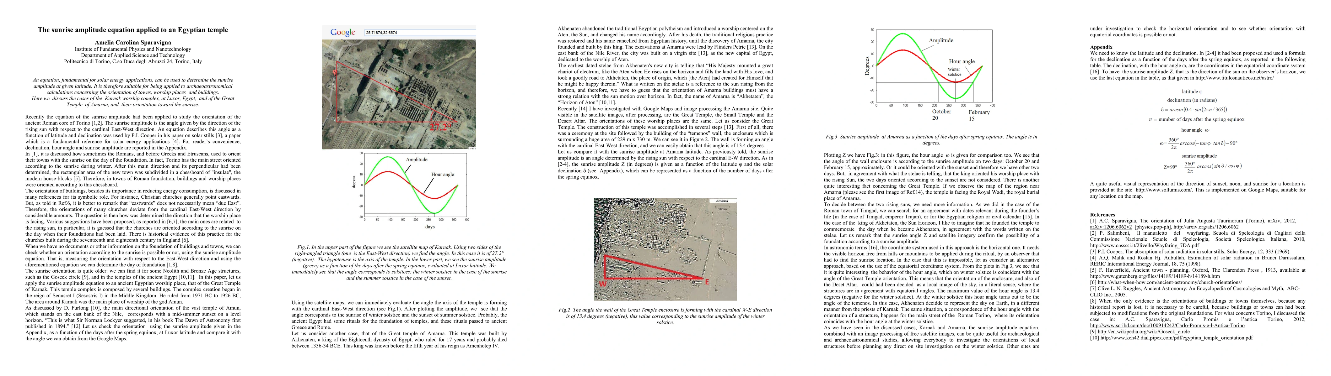 An equation, fundamental for solar energy applications, can be used to determine the sunrise amplitude at given latitude. It is therefore suitable for being applied to archaeoastronomical calculations concerning the orientation of towns, worship places and buildings. Here we discuss the cases of the Karnak worship complex, at Luxor, Egypt, and of the Great Temple of Amarna, and their orientation toward the sunrise.