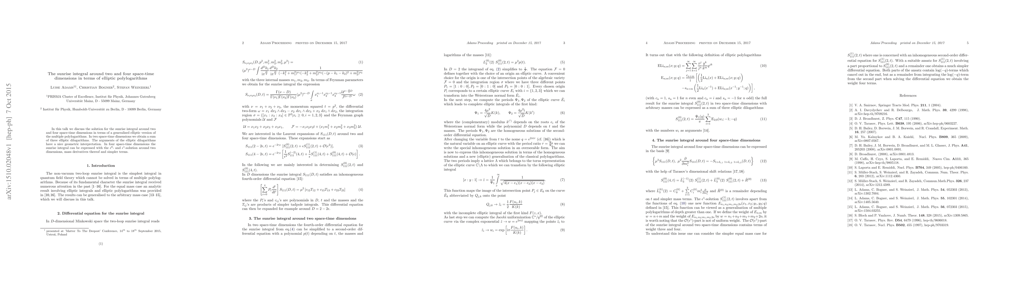 In this talk we discuss the solution for the sunrise integral around two and four space-time dimensions in terms of a generalised elliptic version of the multiple polylogarithms. In two space-time dimensions we obtain a sum of three elliptic dilogarithms. The arguments of the elliptic dilogarithms have a nice geometric interpretation. In four space-time dimensions the sunrise integral can be expressed with the $\epsilon^0$- and $\epsilon^1$-solution around two dimensions, mass derivatives thereof and simpler terms.