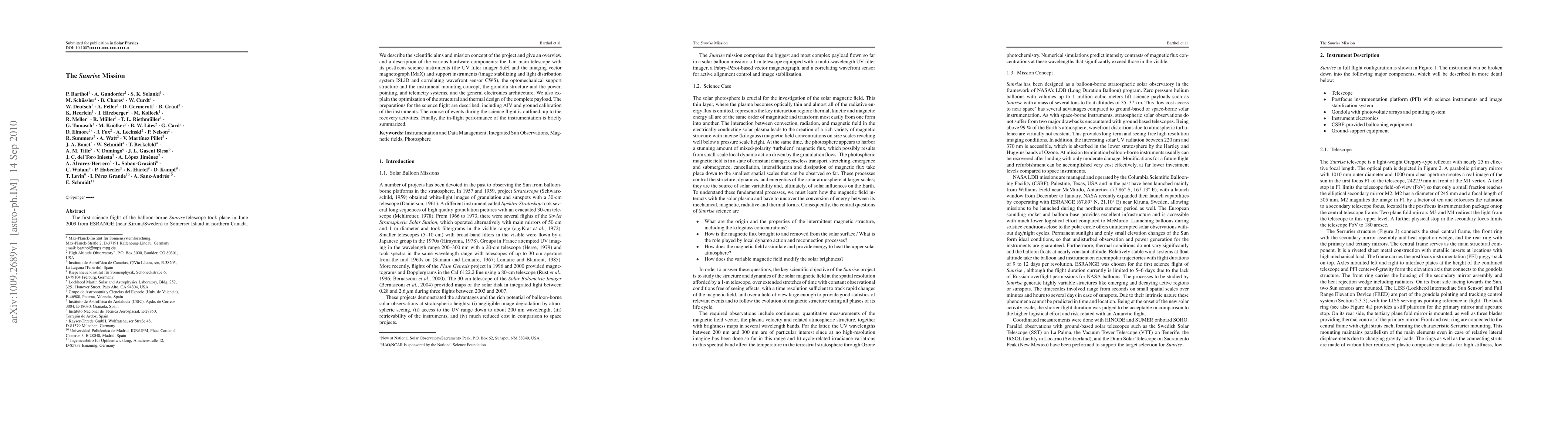 The Sunrise Mission describes the first science flight of the balloon-borne Sunrise telescope, detailing its scientific aims, hardware components, and optimization of structural and thermal design. The paper also covers preparations for the flight, the course of events during the mission, and the in-flight performance of the instrumentation.
