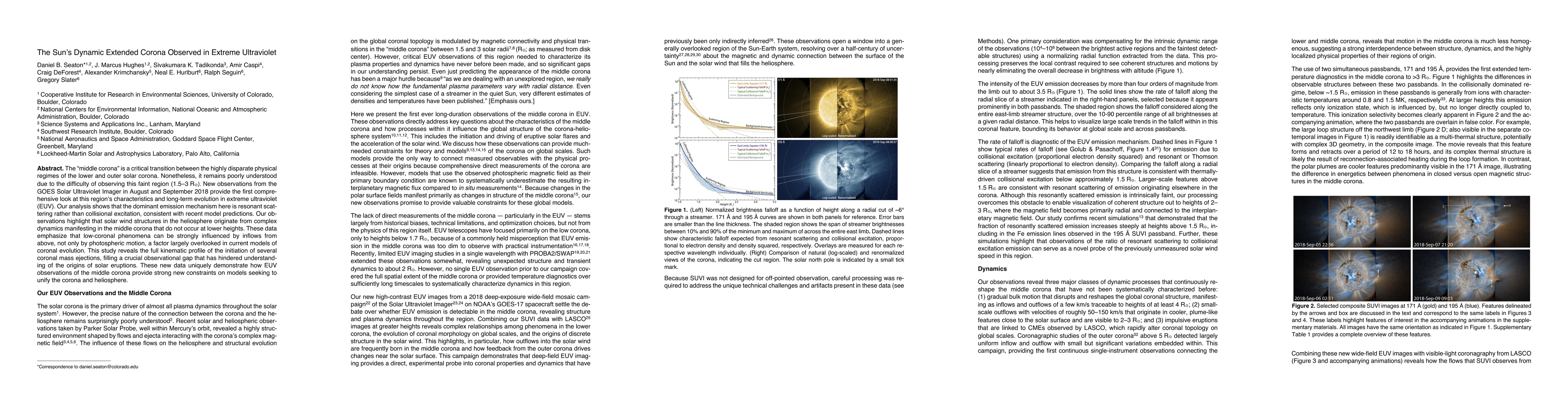 The "middle corona" is a critical transition between the highly disparate physical regimes of the lower and outer solar corona. Nonetheless, it remains poorly understood due to the difficulty of observing this faint region (1.5-3 solar radii). New observations from the GOES Solar Ultraviolet Imager in August and September 2018 provide the first comprehensive look at this region's characteristics and long-term evolution in extreme ultraviolet (EUV). Our analysis shows that the dominant emission mechanism here is resonant scattering rather than collisional excitation, consistent with recent model predictions. Our observations highlight that solar wind structures in the heliosphere originate from complex dynamics manifesting in the middle corona that do not occur at lower heights. These data emphasize that low-coronal phenomena can be strongly influenced by inflows from above, not only by photospheric motion, a factor largely overlooked in current models of coronal evolution. This study reveals the full kinematic profile of the initiation of several coronal mass ejections, filling a crucial observational gap that has hindered understanding of the origins of solar eruptions. These new data uniquely demonstrate how EUV observations of the middle corona provide strong new constraints on models seeking to unify the corona and heliosphere.
