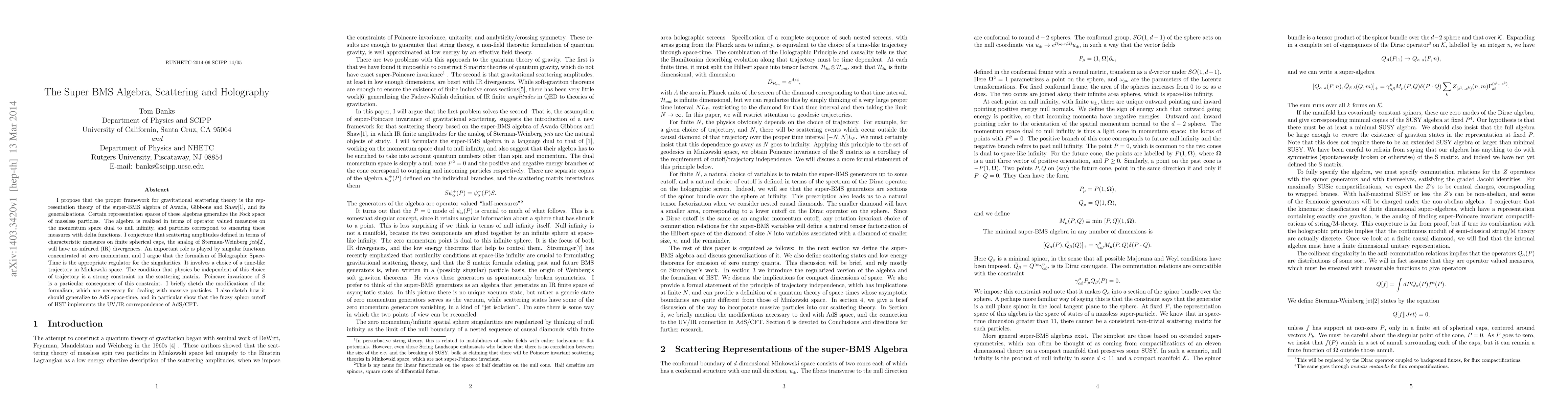 I propose that the proper framework for gravitational scattering theory is the rep- resentation theory of the super-BMS algebra of Awada, Gibbons and Shaw[1], and its generalizations. Certain representation spaces of these algebras generalize the Fock space of massless particles. The algebra is realized in terms of operator valued measures on the momentum space dual to null infinity, and particles correspond to smearing these measures with delta functions. I conjecture that scattering amplitudes defined in terms of characteristic measures on finite spherical caps, the analog of Sterman-Weinberg jets[2], will have no infrared (IR) divergences. An important role is played by singular functions concentrated at zero momentum, and I argue that the formalism of Holographic Space- Time is the appropriate regulator for the singularities. It involves a choice of a time-like trajectory in Minkowski space. The condition that physics be independent of this choice of trajectory is a strong constraint on the scattering matrix. Poincare invariance of S is a particular consequence of this constraint. I briefly sketch the modifications of the formalism, which are necessary for dealing with massive particles. I also sketch how it should generalize to AdS space-time, and in particular show that the fuzzy spinor cutoff of HST implements the UV/IR correspondence of AdS/CFT.