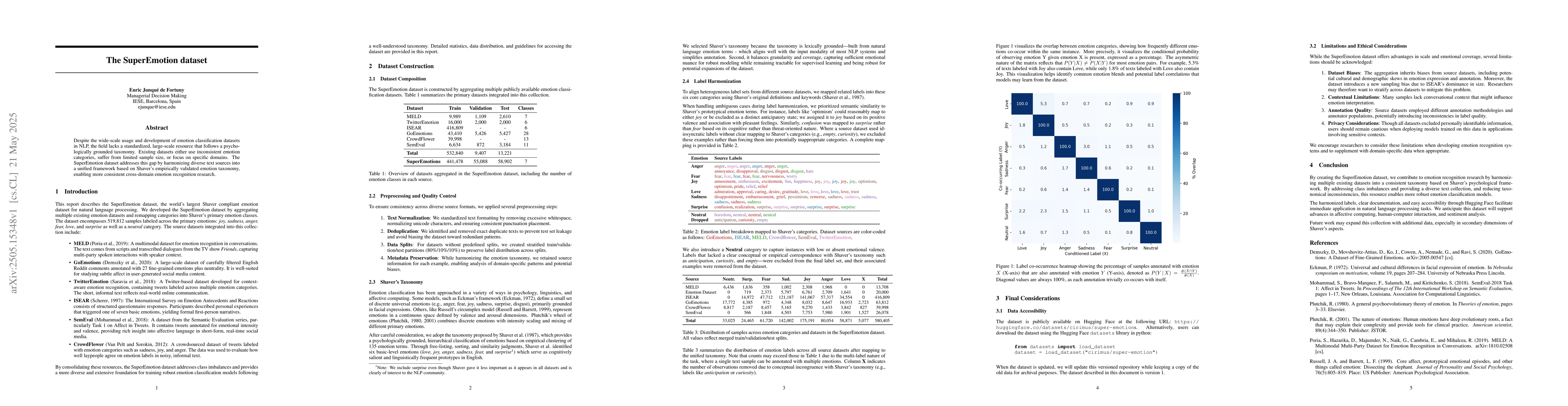 The Super Emotion Dataset harmonizes diverse text sources into a unified framework based on Shaver's empirically validated emotion taxonomy.