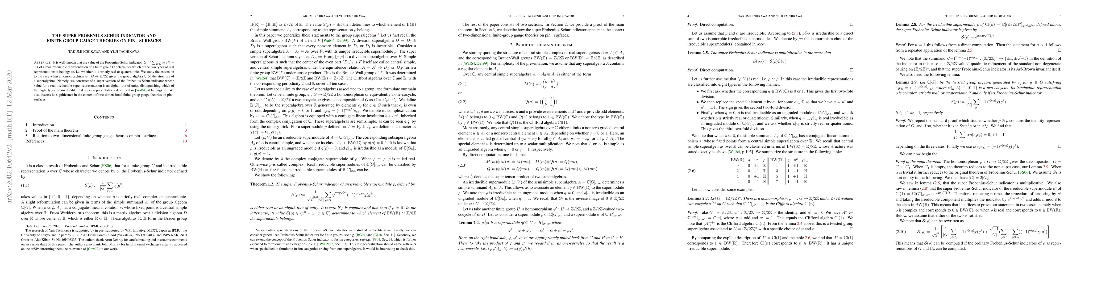 It is well-known that the value of the Frobenius-Schur indicator $|G|^{-1} \sum_{g\in G} \chi(g^2)=\pm1$ of a real irreducible representation of a finite group $G$ determines which of the two types of real representations it belongs to, i.e. whether it is strictly real or quaternionic. We study the extension to the case when a homomorphism $\varphi:G\to \mathbb{Z}/2\mathbb{Z}$ gives the group algebra $\mathbb{C}[G]$ the structure of a superalgebra. Namely, we construct of a super version of the Frobenius-Schur indicator whose value for a real irreducible super representation is an eighth root of unity, distinguishing which of the eight types of irreducible real super representations described in [Wall1964] it belongs to. We also discuss its significance in the context of two-dimensional finite-group gauge theories on pin$^-$ surfaces.