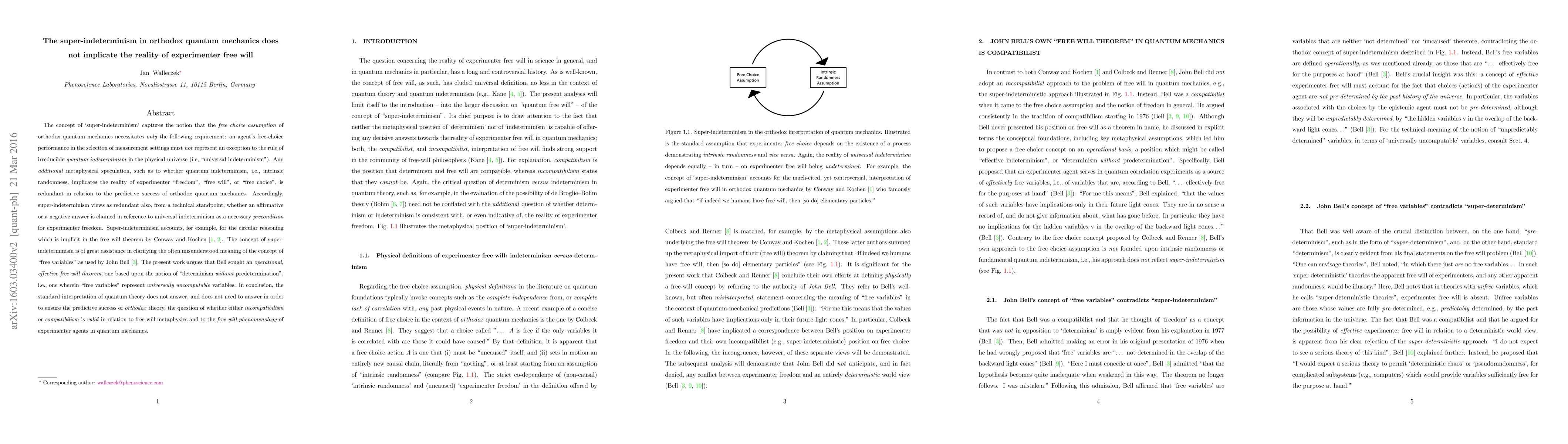 The concept of 'super-indeterminism' captures the notion that the free choice assumption of orthodox quantum mechanics necessitates only the following requirement: an agent's free-choice performance in the selection of measurement settings must not represent an exception to the rule of irreducible quantum indeterminism in the physical universe (i.e, "universal indeterminism"). Any additional metaphysical speculation, such as to whether quantum indeterminism, i.e., intrinsic randomness, implicates the reality of experimenter "freedom", "free will", or "free choice", is redundant in relation to the predictive success of orthodox quantum mechanics. Accordingly, super-indeterminism views as redundant also, from a technical standpoint, whether an affirmative or a negative answer is claimed in reference to universal indeterminism as a necessary precondition for experimenter freedom. Super-indeterminism accounts, for example, for the circular reasoning which is implicit in the free will theorem by Conway and Kochen. The concept of super-indeterminism is of great assistance in clarifying the often misunderstood meaning of the concept of "free variables" as used by John Bell. The present work argues that Bell sought an operational, effective free will theorem, one based upon the notion of "determinism without predetermination", i.e., one wherein "free variables" represent universally uncomputable variables. In conclusion, the standard interpretation of quantum theory does not answer, and does not need to answer in order to ensure the predictive success of orthodox theory, the question of whether either incompatibilism or compatibilism is valid in relation to free-will metaphysics and to the free-will phenomenology of experimenter agents in quantum mechanics.