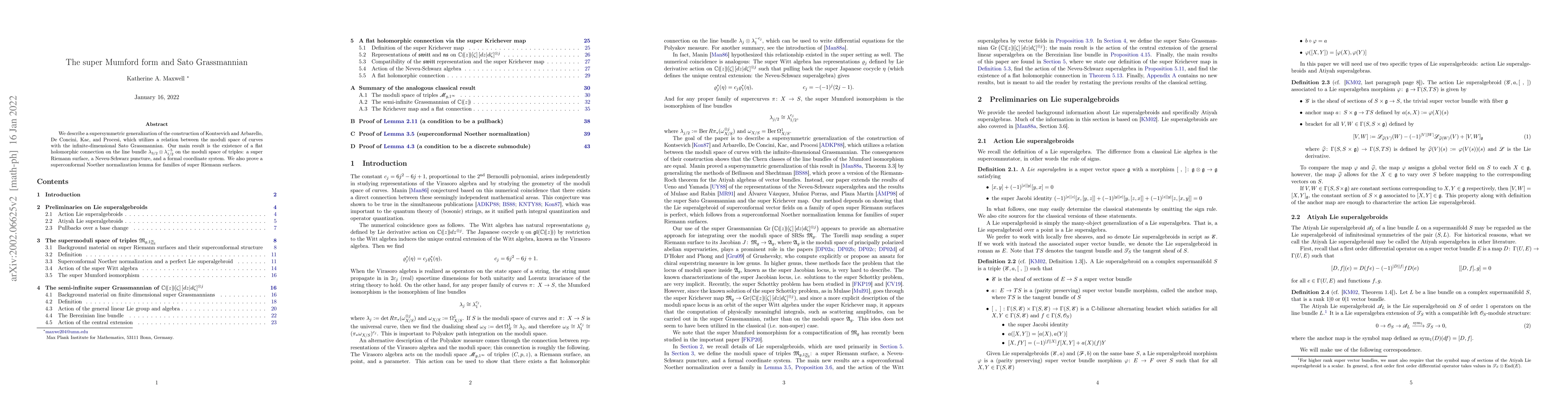 This paper generalizes the construction of moduli spaces of curves to a supersymmetric framework, establishing a connection between these spaces and the Sato Grassmannian. The key result is the existence of a flat holomorphic connection on a specific line bundle over a moduli space of super Riemann surfaces, along with a superconformal Noether normalization lemma.