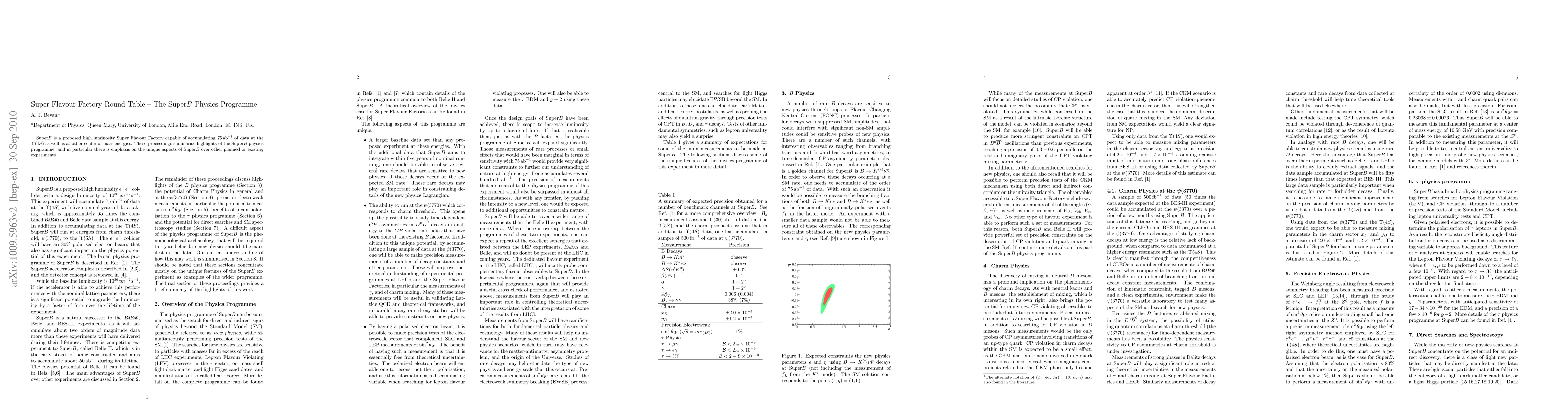 Summary: The SuperB Physics Programme outlines a high luminosity Super Flavour Factory designed to collect 75/ab of data at the Y(4S) and other energies. It emphasizes the unique features of SuperB compared to other planned or existing experiments.