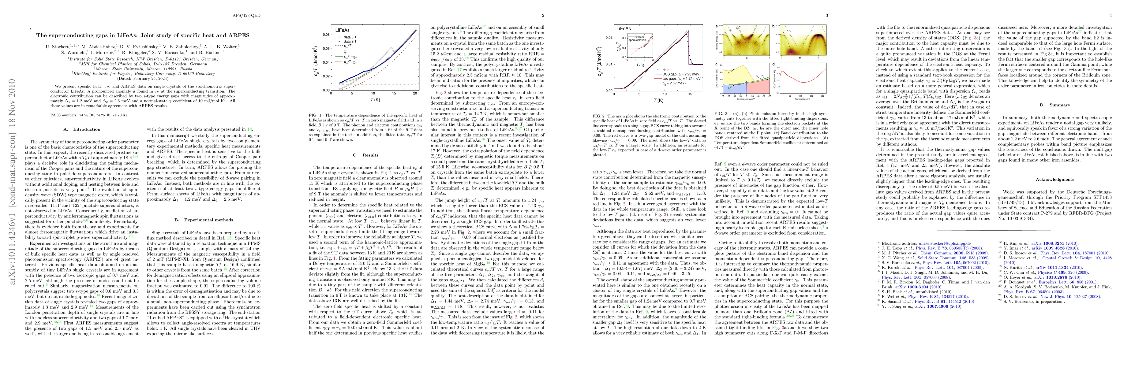 We present specific heat, c_P, and ARPES data on single crystals of the stoichiometric superconductor LiFeAs. A pronounced anomaly is found in c_P at the superconducting transition. The electronic contribution can be described by two s-type energy gaps with magnitudes of approximately Delta1 = 1.2 meV and Delta2 = 2.6 meV and a normal-state gamma coefficient of 10 mJ/mol K^2. All these values are in remarkable agreement with ARPES results.